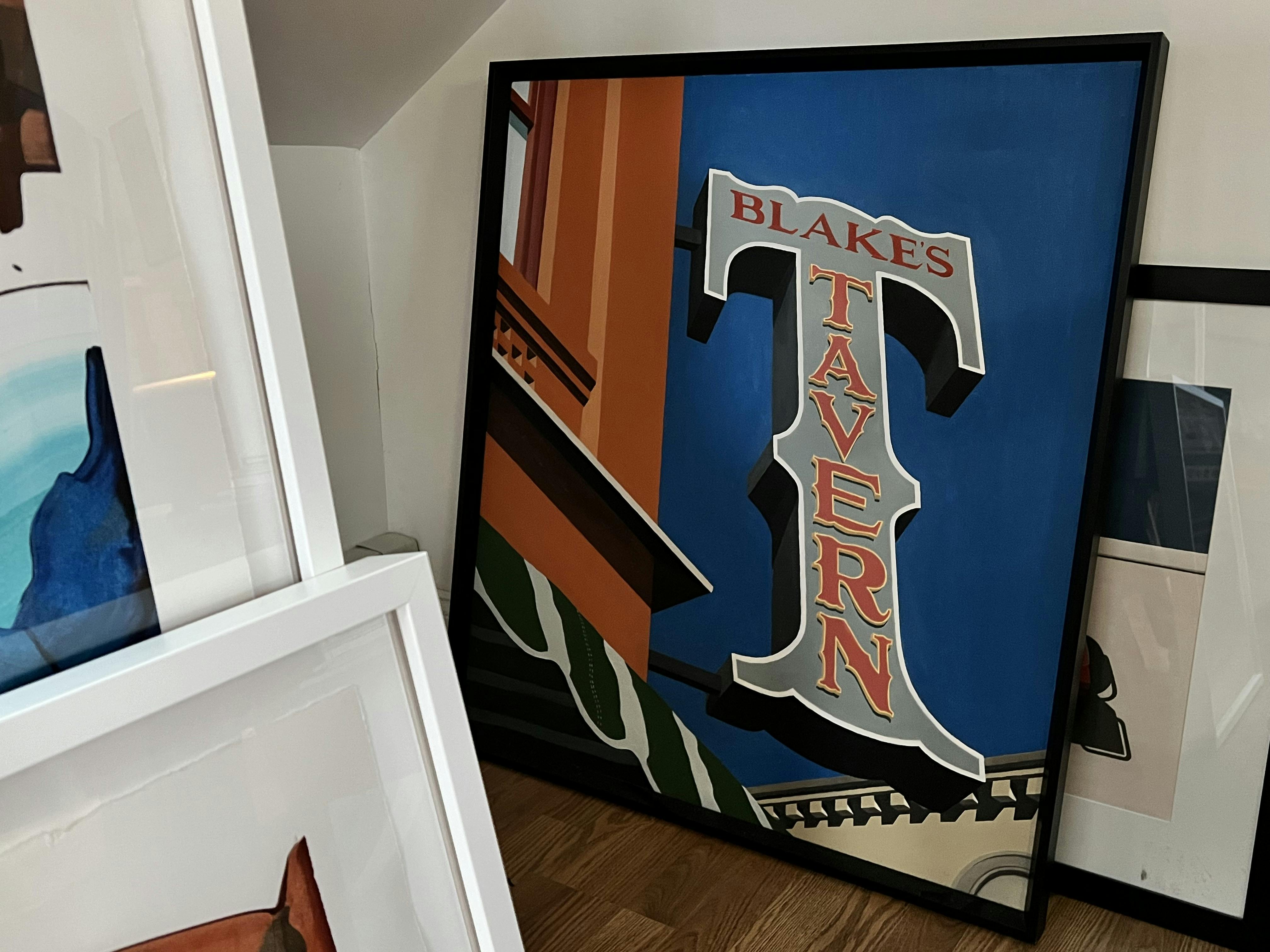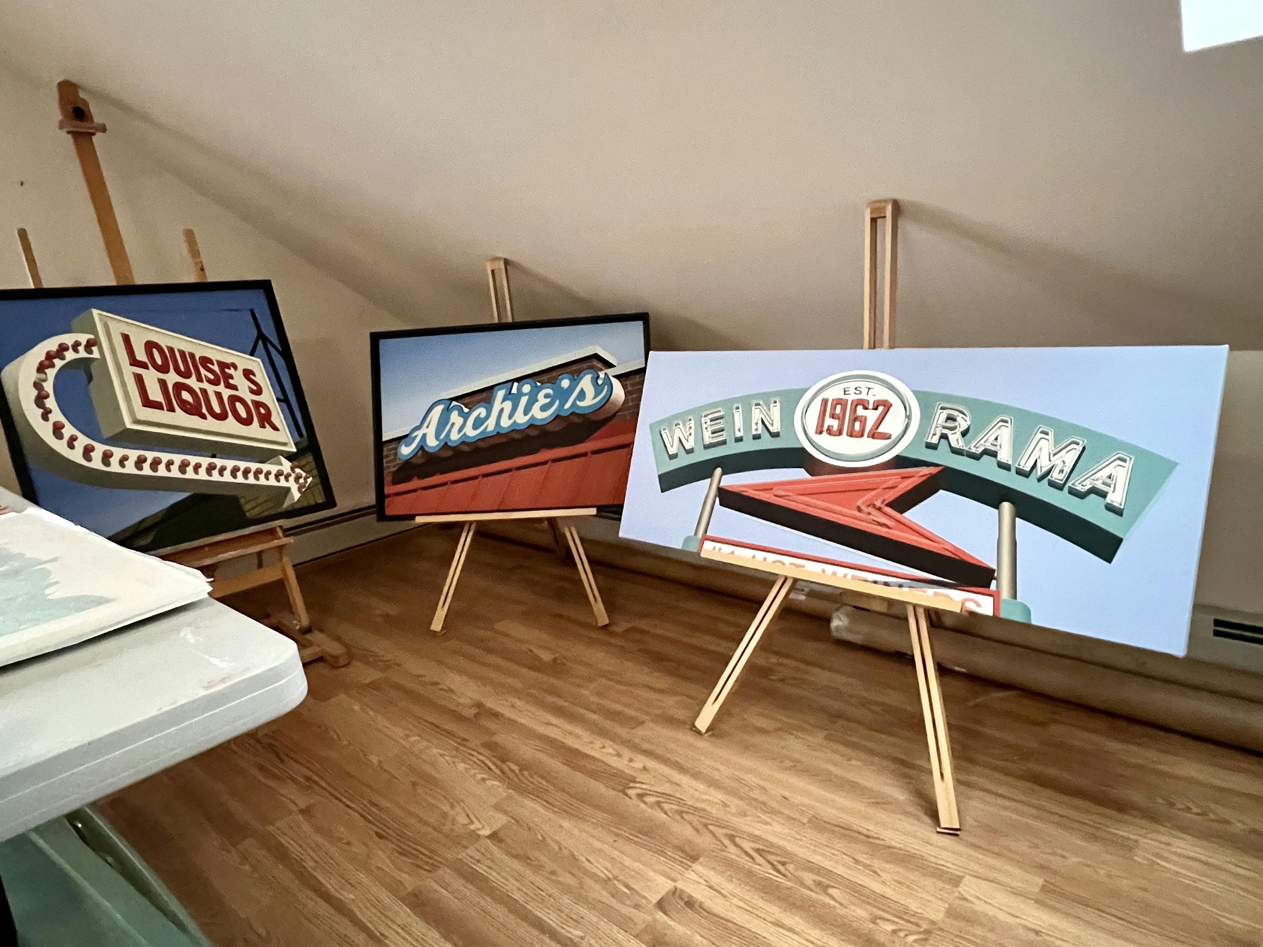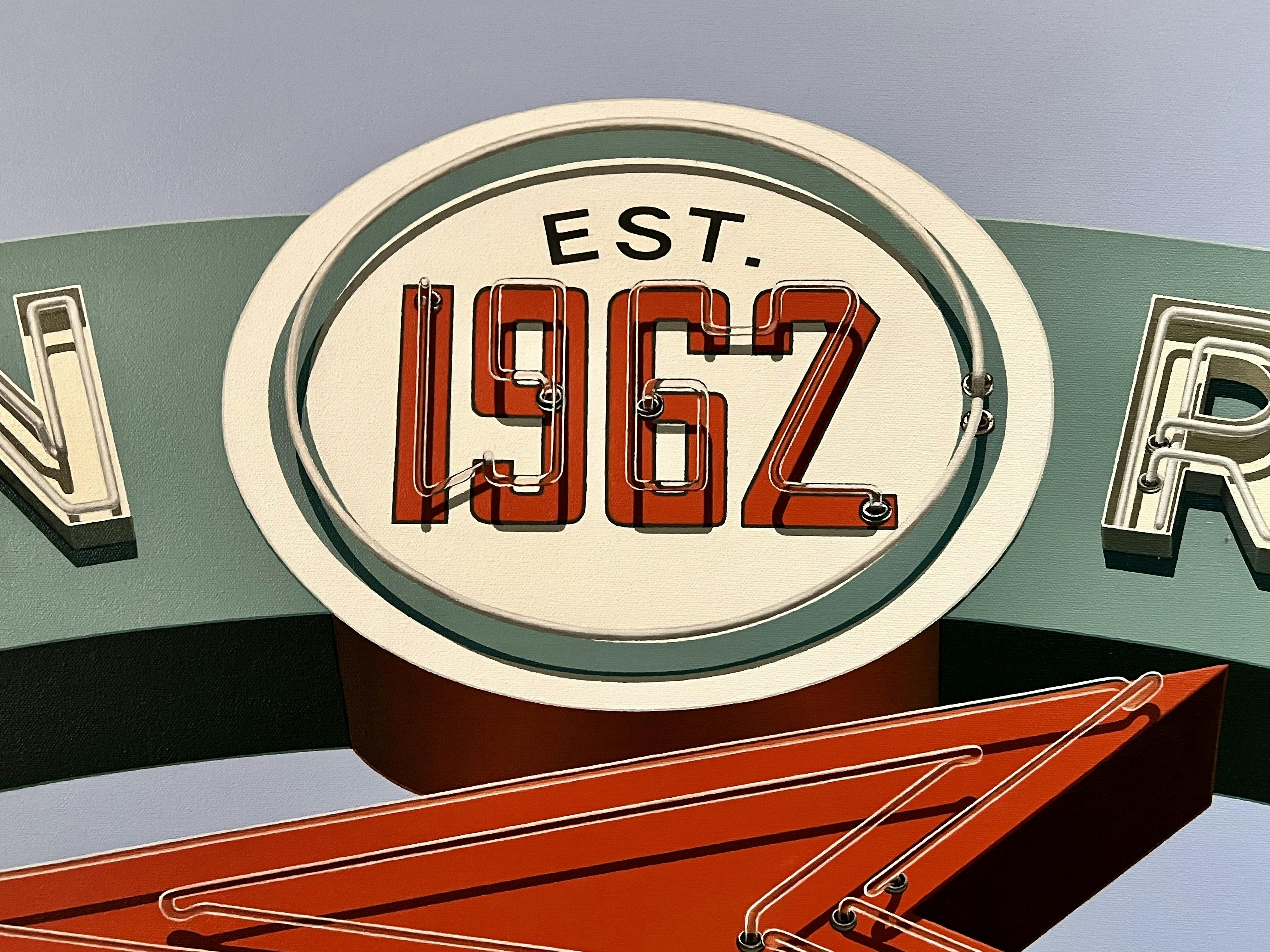 Schechter says of living in the Ocean State, “Being an artist working in Rhode Island has been a source of both inspiration and support to me. I studied design at RISD and settled in Rhode Island after college. Soon after graduating, I noticed some of my favorite old buildings were being demolished for new development. I was also at the beginning of my design career and soon realized I had more to express than is possible with design alone. I longed to make art and began to use painting as a medium to document the buildings that I loved. As my painting progressed, I started to home in on the signs on these buildings, finding inspiration in local landmarks.”