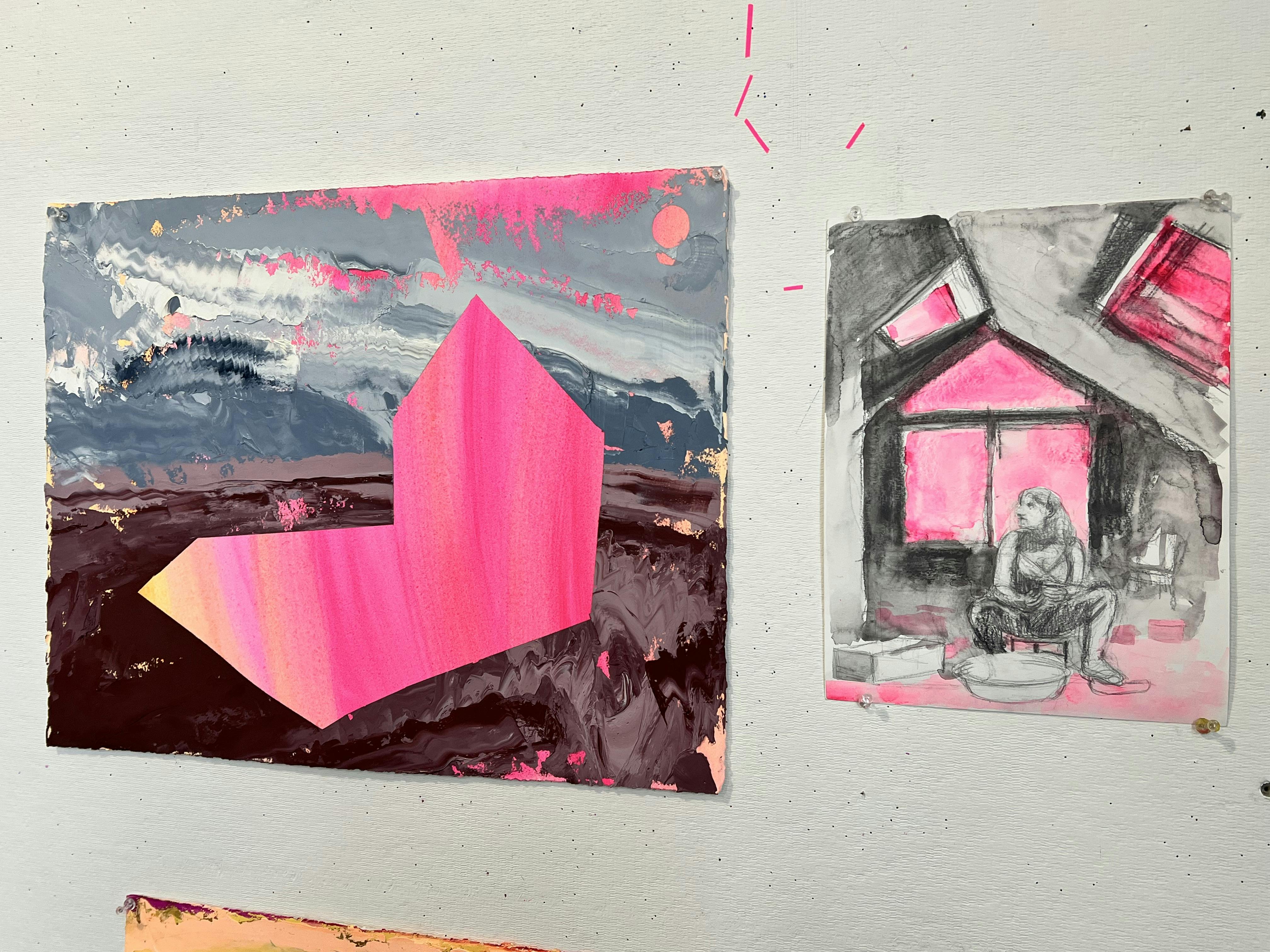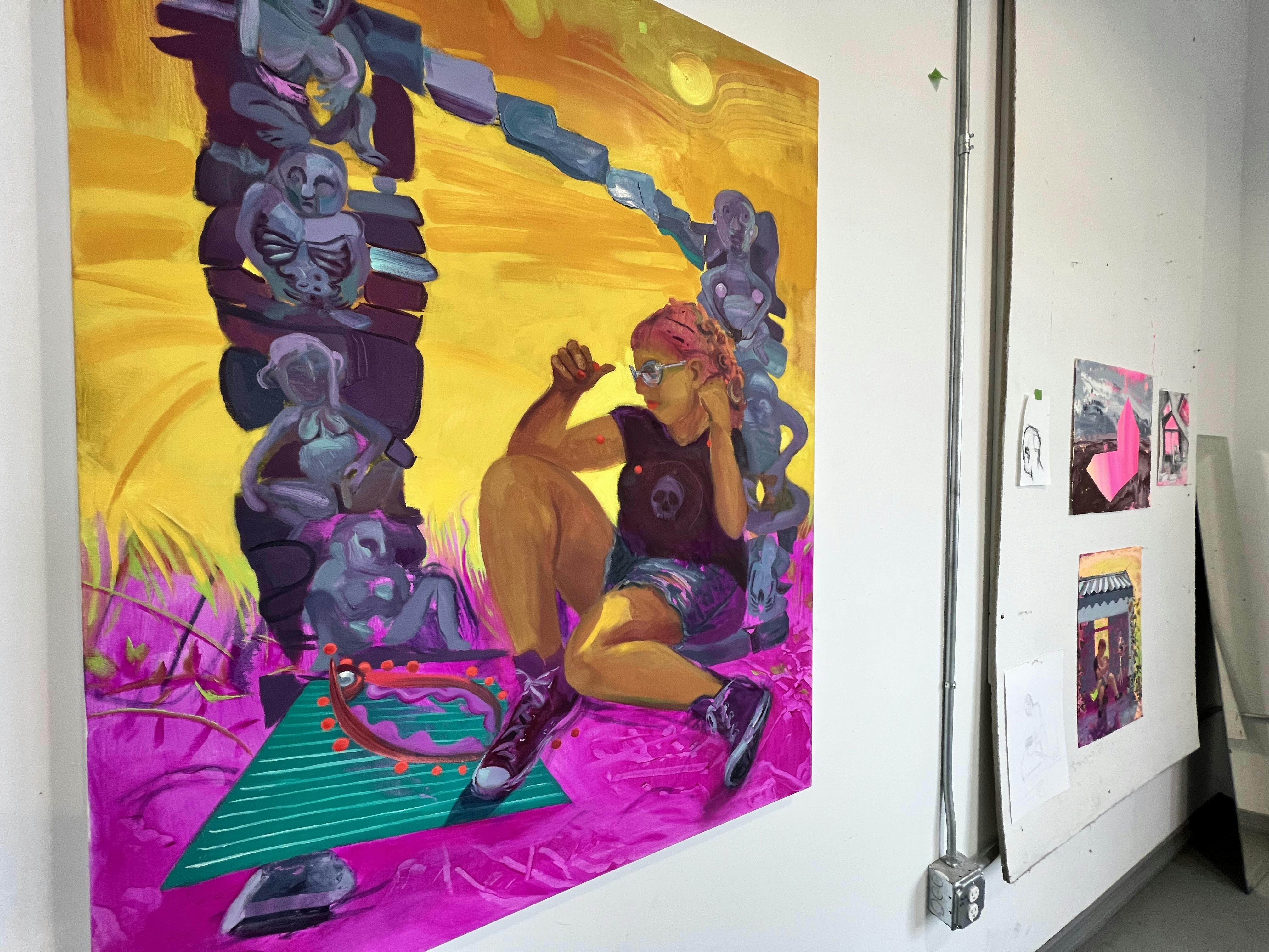 If motherhood is a core narrative in work, then color is a central tenet of Schireson’s craft as an artist. Her paintings are vivid. Fluorescent colors attract and retain the eye of the viewer. And in her show at Cade Tompkins Projects, she is hoping that audiences experience the depth and breadth of the color she is offering. Asked what she hopes people experience when looking at her work, Schireson answers, “I hope they feel like they’re swimming in color. Like a 'color bath' version of a sound bath - rejuvenating, fresh and offering reflection. I hope that it opens up a line of thinking about the ways that all of us, regardless of being mothers or not, balance care for everything that grows in our lives. That our own solitary ambitions or creative interests are sacred and also need to be nurtured and given the space that they fill.”