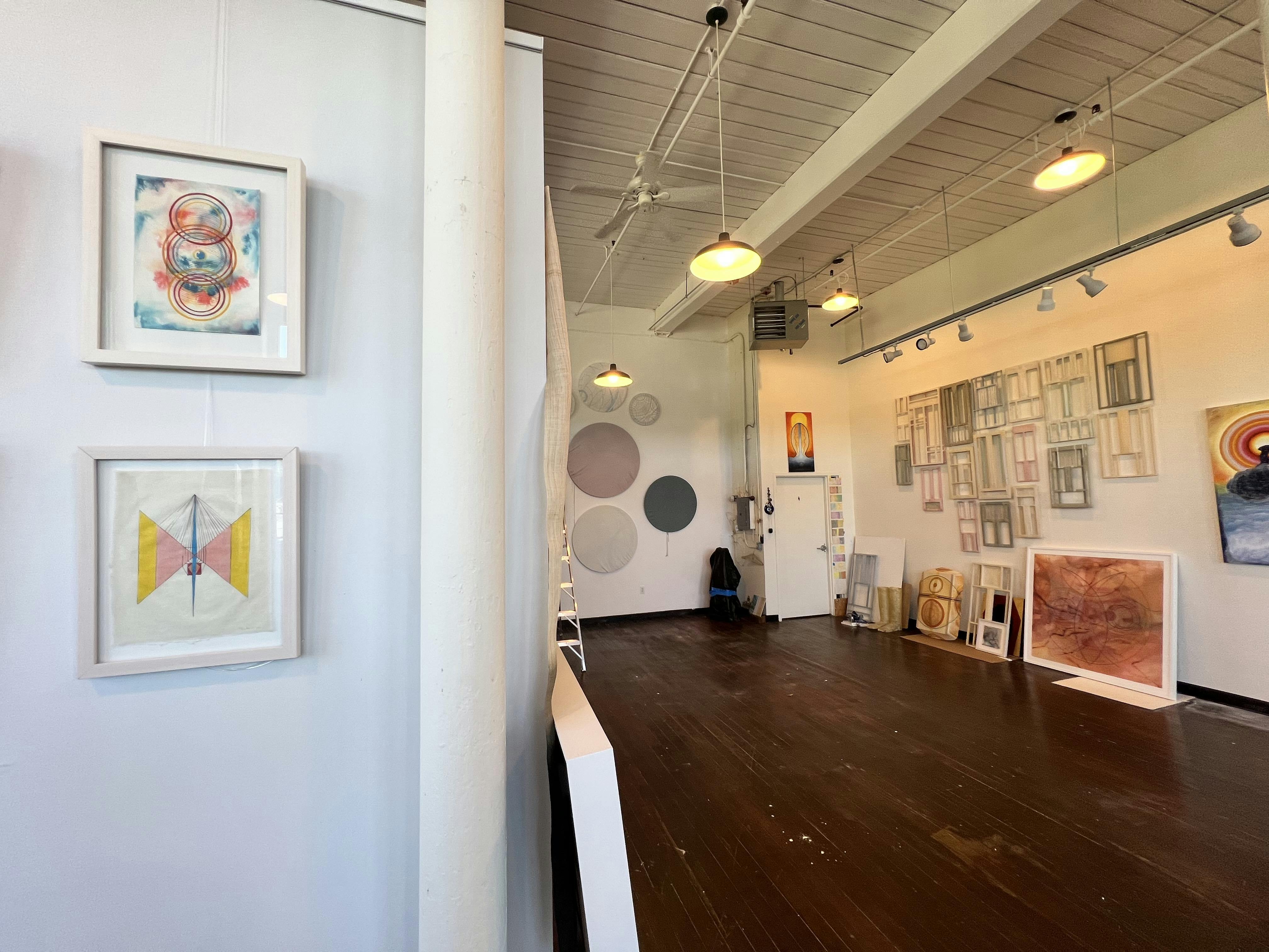 Looking at Heuser’s paintings spread across a long wall in her studio, one finds throughlines like an interest in craftsmanship and design, as well as her unique visual vocabulary of line, shape, and form. Materials like inks, oils, acrylics, gouache, and gold leaf are employed expertly, creating subtle images that have broad appeal. Beyond painting, Heuser has also made drawings, sculptures, works of printmaking, and exquisitely made sculptural works rendered in paper.