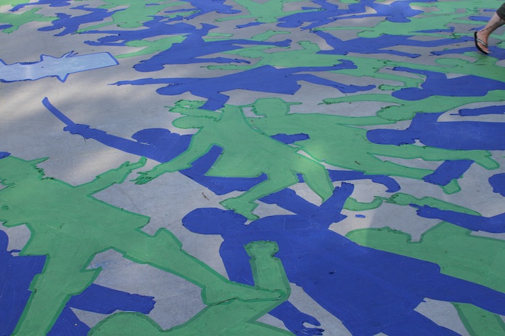 If you have walked downtown near Kennedy Plaza any time in the past month, you have probably noticed the gradual transformation of the Bank of America Skating Center into a huge mural of a tree. Occupying the entire rink, this “mural” is a large-scale temporary Tape Art Installation and has been a work in progress for the past three weeks to honor the 375th Anniversary of the City of Providence.