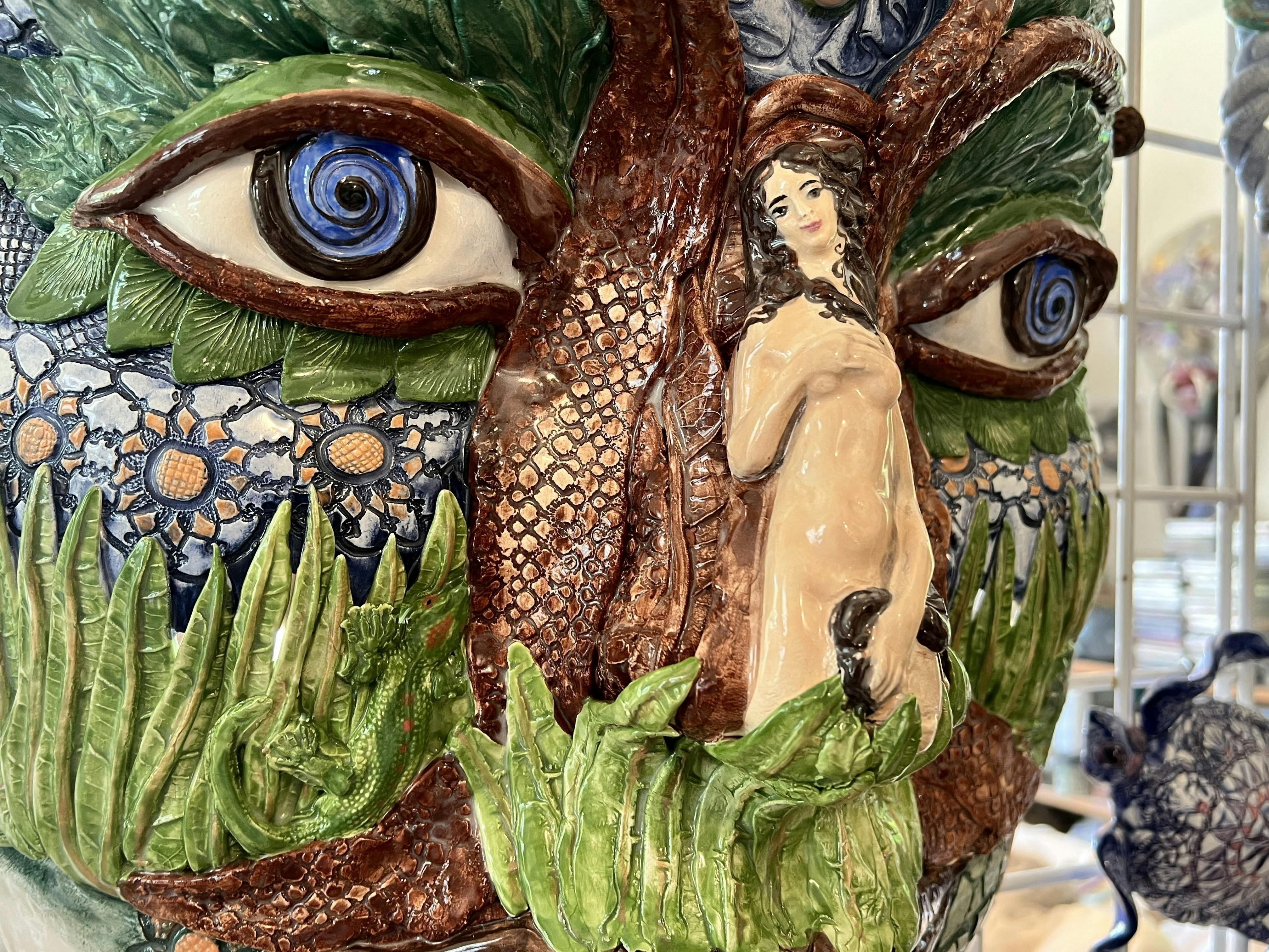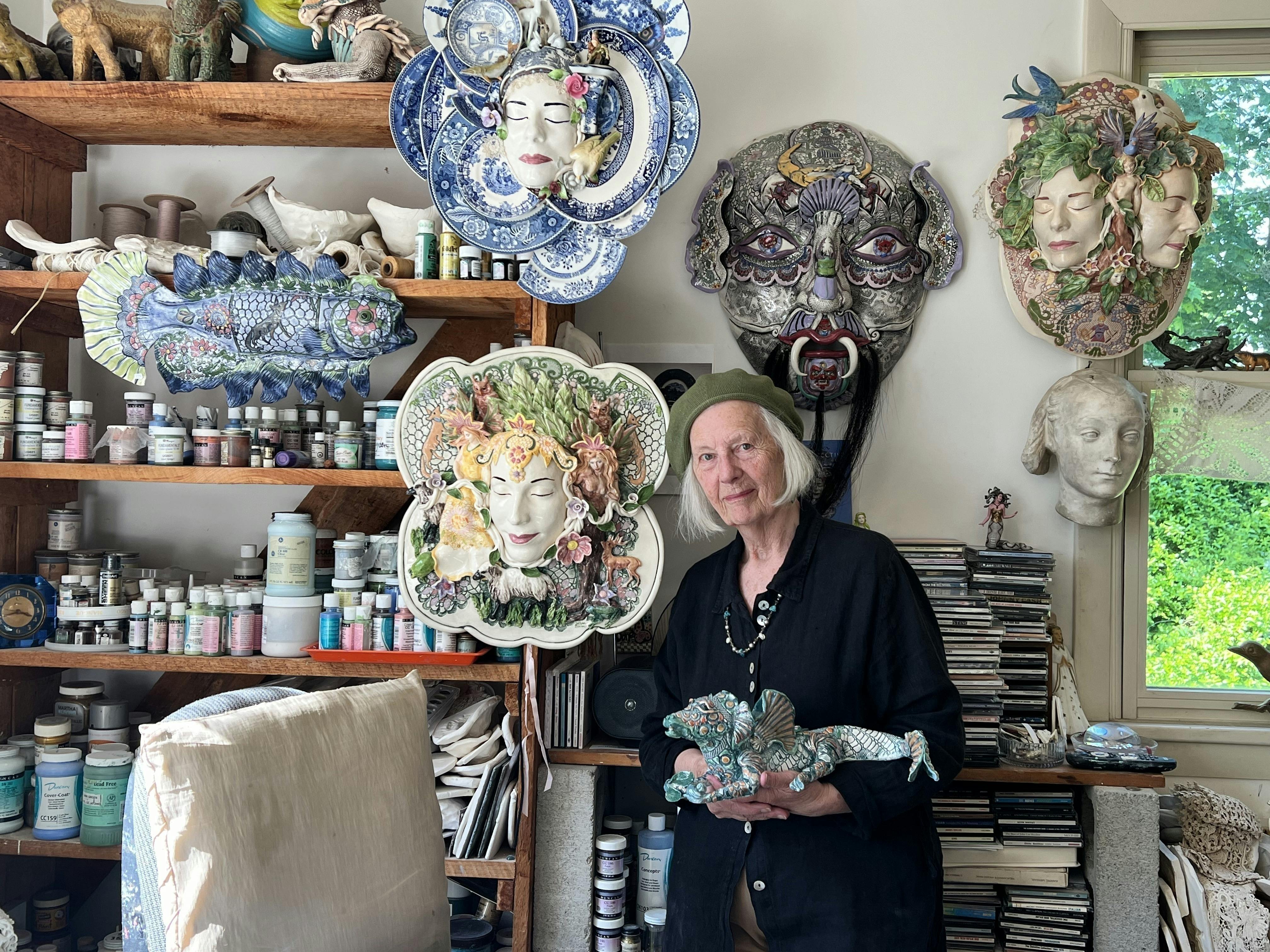 Reflecting on her love of the clay medium, Barber explains that her many years of experience with ceramics have added to her dexterity. She says, “Working with clay is second nature to me. We know each other well. When I go into the studio with the thought of creating a winged creature, the form grows and comes to life as if by magic. Clay lets me manifest visions.” In her creative space, every surface is covered with reference materials, tools, or completed works. The room is also festooned with ribbons and plaques she has received throughout her career.