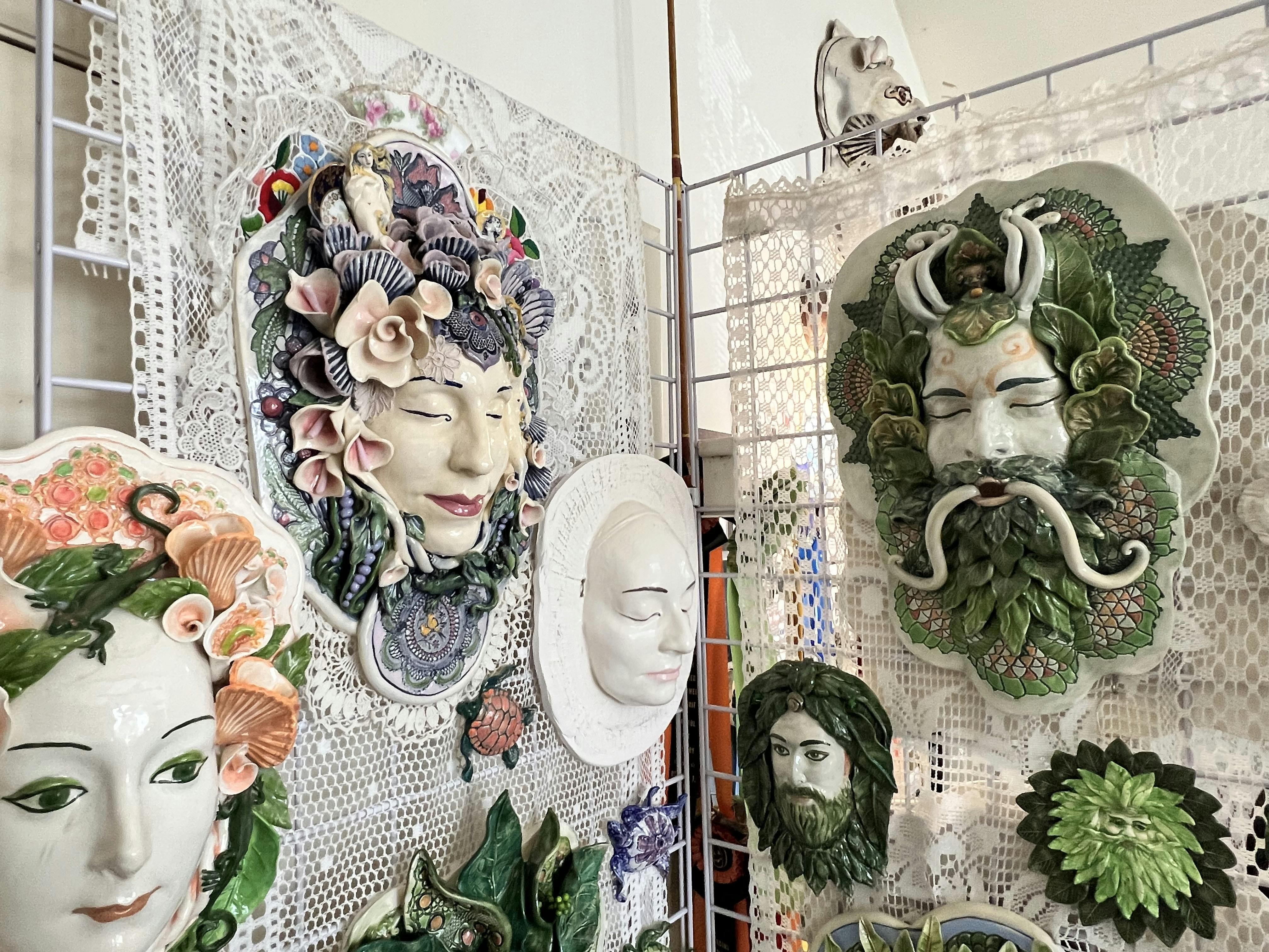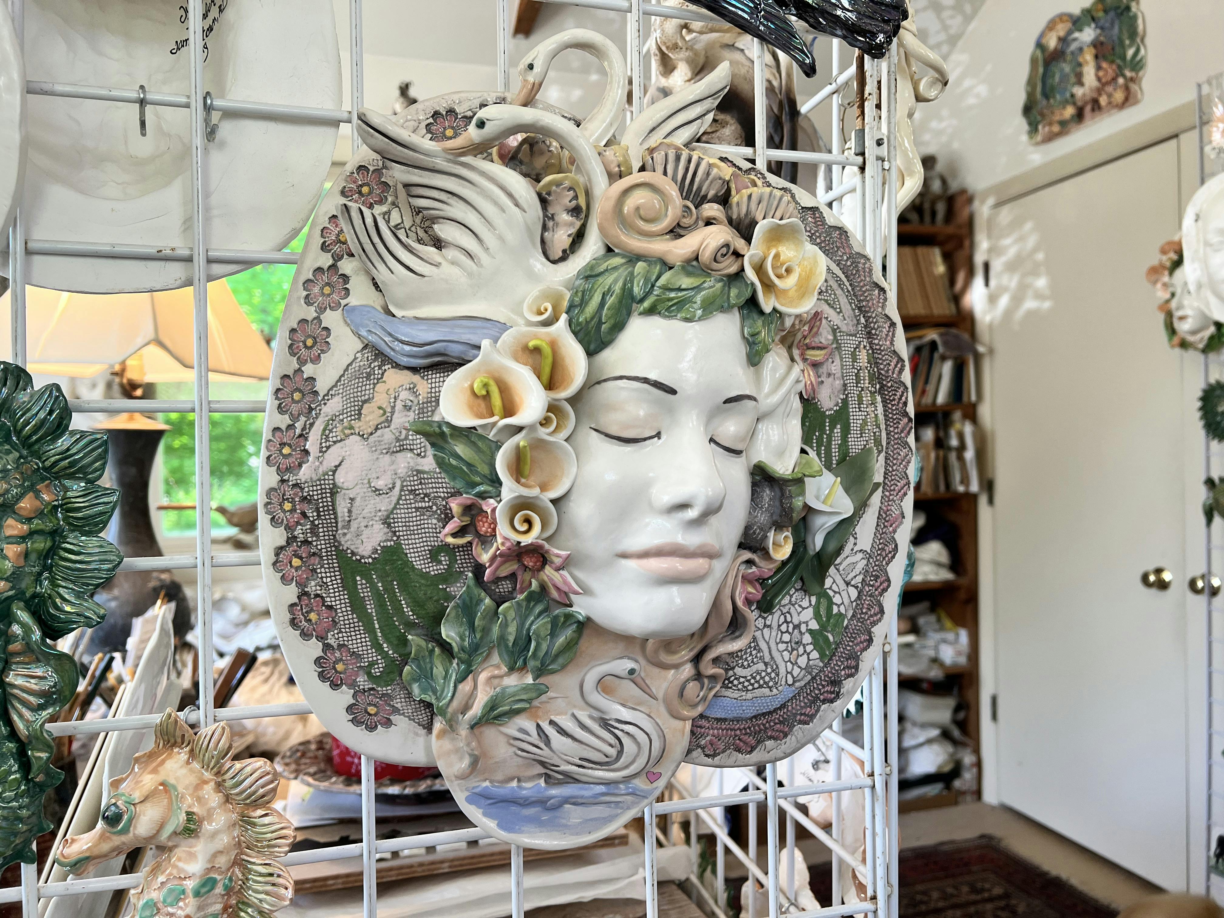 Barber was born in the United Kingdom but grew up in Westerly. Today, she resides in a seaside cottage in Jamestown and has a bright, custom built home studio where she crafts and fires her sculptural ceramics. Masks are a recurring theme, as are animals, and imagined creatures and characters. She often employs lace to create uniquely textured surfaces which she then details with glazes. There is a sense of whimsy that is singular to Barber and she has sold work to clients across the country.