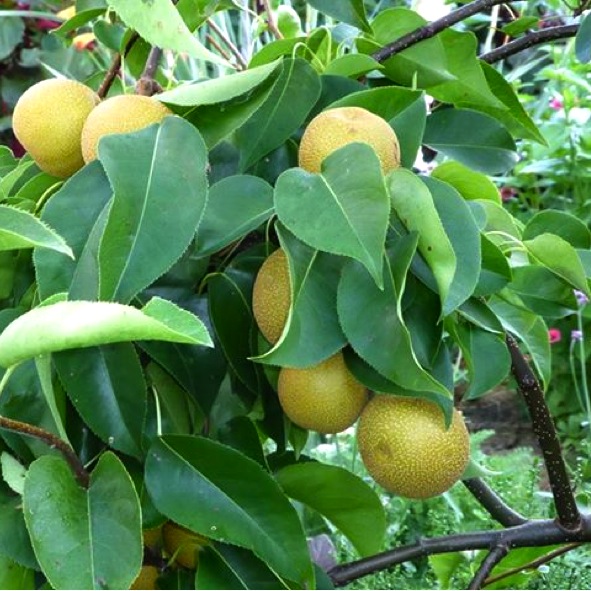 A tip for planting trees: this is a spiritual act, be thoughtful and reach within for gratitude and hope. The future is now. Dig a $100 hole for a $10 tree. By that I mean mix compost, bonemeal, 10-10-10 fertilizer, a handful of dolomite pelletized limestone and lots of love. Then, gently plant the dormant tree firmly in the ground with the soil matching the obvious soil line on the nursery stock. Tamp down and water. You may wish to stake the tree, again, gently but firmly. Fruit trees do best in full sunlight. I had 23 pears the first year, you’re looking at the second year’s crop. Compare prices in the market for these oriental beauties, so flavorful, nutritious and lovely. Each of my trees cost $21.