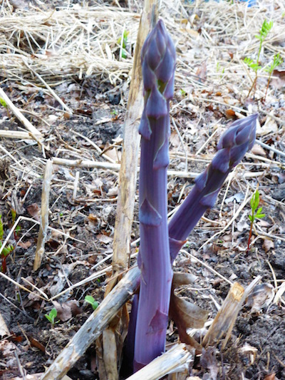 Do mulch heavily over the winter. Asparagus does very well under a permanent mulch. The delicious spears begin to emerge just around the last frost date. Keep an eagle eye on the asparagus bed. The shoots pop out of the soil and grow very quickly. Reward yourself for the two year wait, it is worth it. Grasp the shoots below the mulch and break off. Be vigilant, the now established roots send up new shoots. You’ll relish the thick spears for dinner and leave the pencil sized shoots to grow and nourish the root systems. A dozen asparagus plants will provide an abundant harvest of spears for weeks. Do consider the future and allow the smaller shoots to mature. They will quickly grow. Don’t bother harvesting these lesser shoots or cut down taller shoots. For a very short time the entire stem of asparagus is edible, soon however the shoot forms tough fibrous stalks.