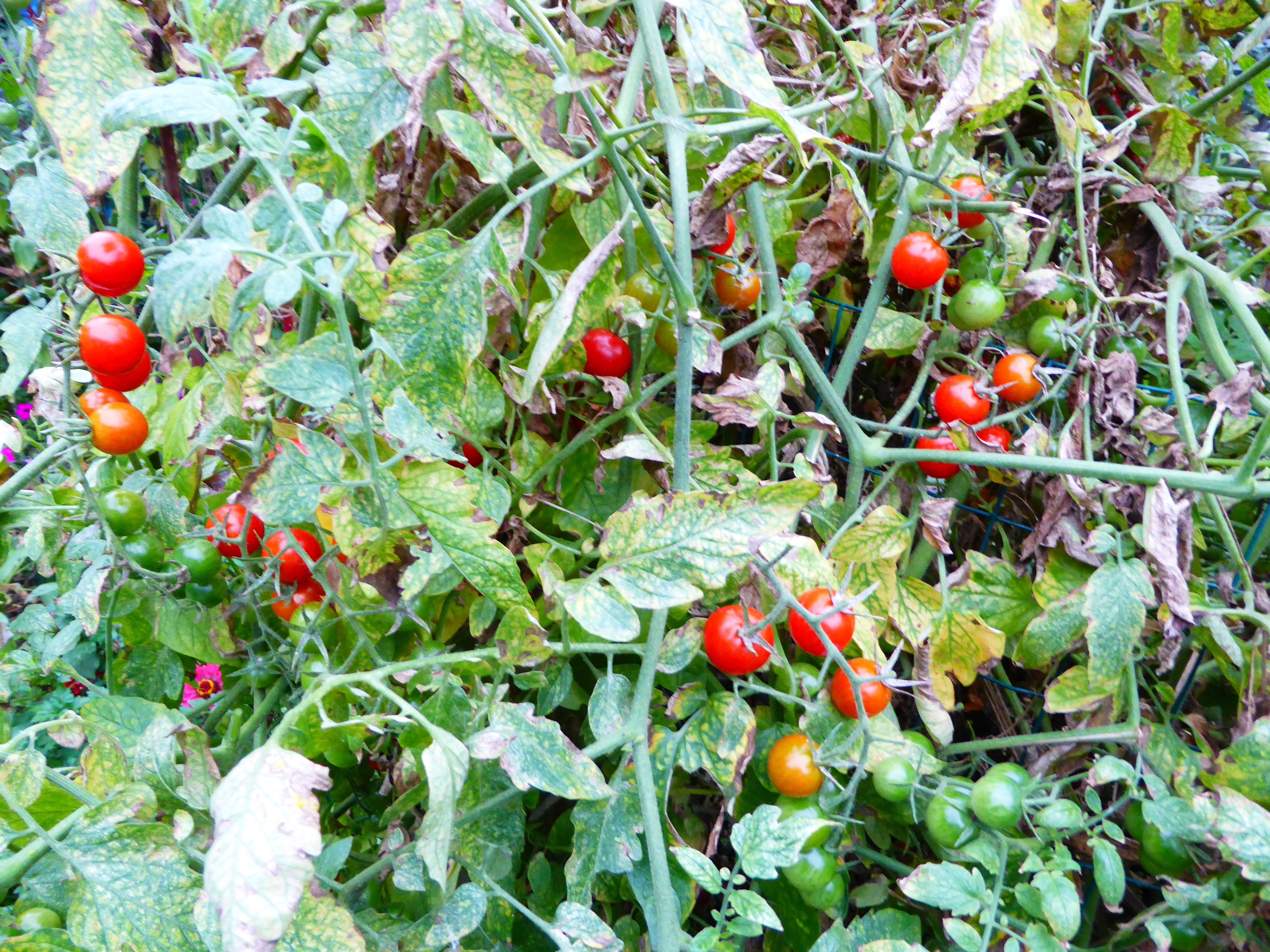 The summer’s hay mulch is fast disappearing beneath those tomatoes that just won’t quit. Tomatoes pollinate when night time temperatures are above 62 F degrees. Those that remain are swollen with goodness. The last to hang on are the Jet Star cherry tomatoes and those curiously huge white tomatoes grown for novelty’s sake. Most gardeners just can’t keep up with the cherry tomatoes. I trim back leaves and stems to reveal the ripe red tomatoes and expose the still numerous green tomatoes to sunshine.