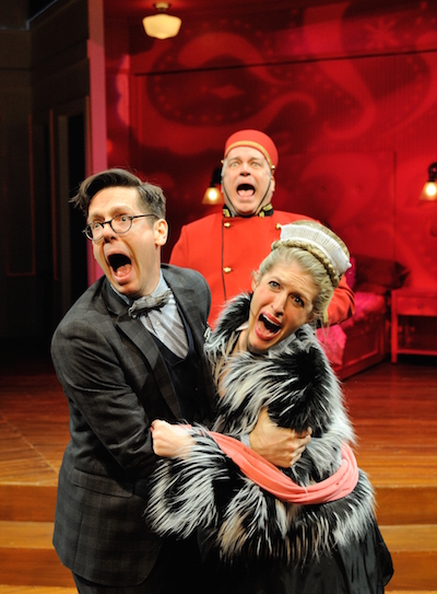 Not quite all is lost, however, in this production. Sullivan’s Victor Emmanuel is buffoonish and whiny, but his portrayal of Pocket, the put-upon, inebriated hotel factotum, is wonderful in its weary physicality and slurrily intonated speech. Alex Woodruff has some very fine moments as the cuckolding maid Antoinette. Elise LeBreton’s Eugénie is the funniest person on stage during the brief moments she stolidly chews a sandwich while chaos swirls around her.