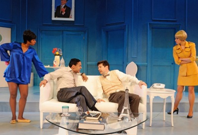 The set-up shows its age, much like an episode of Love, American Style does in a post-HBO world: Bernard (Joe Wilson, Jr.), an American architect living in Paris, keeps three mistresses--all of them stewardesses--literally in the air, managing his polygamous lifestyle by adroit use of their air travel timetable. The three gals come and go from his flat (in Trinity’s production, a blue and white confection by Patrick Lynch that evokes the color scheme of Pan-Am Airlines) as regularly as their jets come and go from Orly Airport.