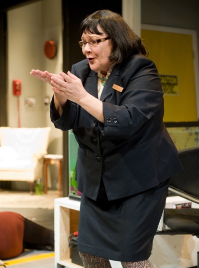 One of the best bits of fun in Boom is enjoying Nachtrieb’s movement up and down several layers of story-telling and meaning. The play appears to be set in a college lab, and the action appears to open with nerdy marine biology grad student Jules (Marc Dante Mancini) meeting Jo (Gillian Williams), a cynical journalism major who has responded to Jules’ personal ad seeking a partner for “sex to change the course of the world.” But just adjacent to that lab, a cheerfully docent-esque Barbara (Wendy Overly) invades the action sporadically from her wingback chair with commentary and interventions (including throwing a large electrical switch that can freeze the action or drop Jo to her knees). Barbara welcomes us to an “exhibit” that she tells us she manages--this set populated by Jules and Jo. And so part of the fun begins: are Jules and Jo really Jules and Jo? Or are they actors within actors, recreating events in a weird post-modern museum? Is Barbara divine? Or chaos itself?