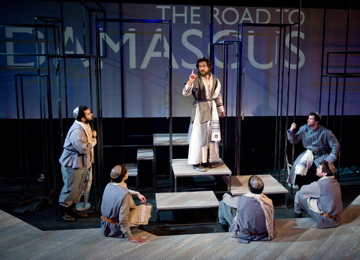 From this dramatic precipice, playwright Brenton retraces Paul's steps, literally, from an epiphanic moment on the road to Damascus some 30 years prior. In flashback, we meet Saul of Tarsus, a Roman citizen of Jewish faith who zealously performs his work of scouring the landscape of Jews who follow Christ.