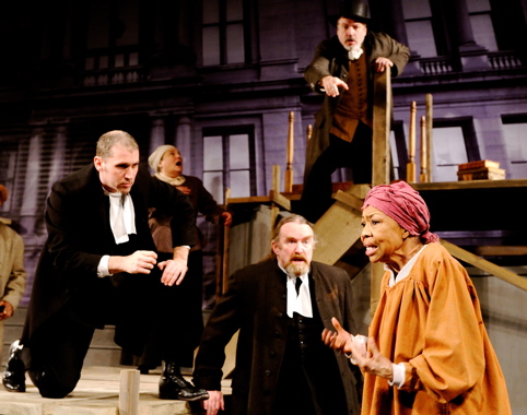 Secondly, a concept setting by Eugene Lee, which looked gorgeous as a model pictured on the cover of Trinity's promotional magazine, fell largely flat. Literally. An enormous black and white photo mural of Providence's City Hall backs the performance, and the play is performed on broad gray steps, with some rustic scaffolding to give verticality to the movement. It's pretty obvious where this is all heading, from the witness borne in the town square to the gallows-like foreshadowing of the scaffolds. It isn't played as a play within a play (thank goodness), but neither does it particularly make sense to see Puritans on the steps where Haven Brothers used to be.