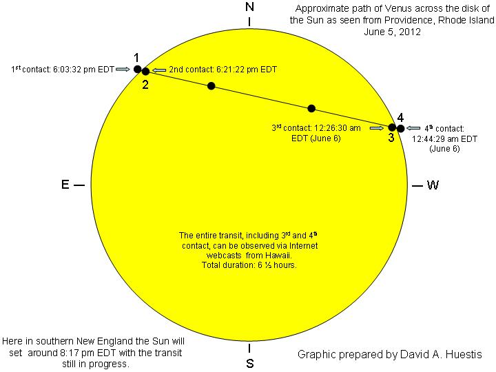 The following times have been specifically calculated for Providence. Though these times will vary by geographic location, the difference for locations throughout the New England region will only be a matter of seconds. (See accompanying graphic of the path of Venus across the face of the Sun.)