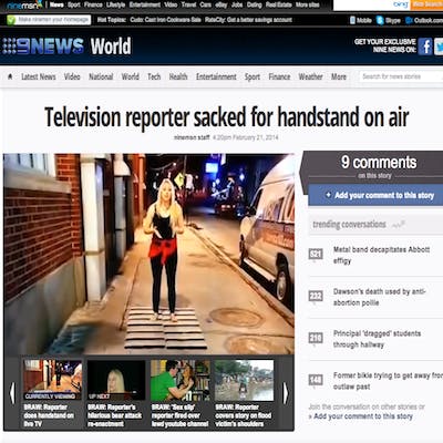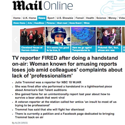 Jim Romenesko is a Midwestern journalist who runs one of the most popular blogs on media and politics amongst industry insiders. He deemed the story significant enough to garner attention on his site, posting a story on Tremel Monday entitled "Rhode Island TV Reporter is Fired After Doing Handstand on Air." Romenesko updated the story to include his favorite comment that someone had posted on his Facebook page in response to the story on the firing: "If you send your reporter out to shill for your network’s TV show, there really is no standard low enough to define a firing offense."