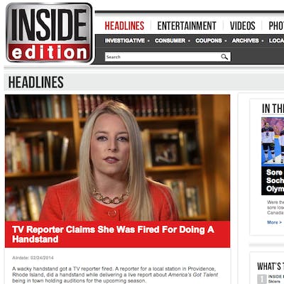 Inside Edition, one of America's most popular national entertainment and celebrity television programs, ran a story on Tremmel on the air Monday, getting even more dish from Tremmel on the firing. "They did a full blown investigation on the handstand piece as if it was a murder investigation,” said Tremmel of WJAR in the Inside Edition story.