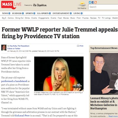 MassLive, a Springfield, MA metro-area news website affiliated with the newspaper The Republican, featured a piece by reporter Ray Kelly on Tremmel's firing, citing GoLocal's exclusive. Tremmel is well known in the Springfield area from her turn on WWLP-TV as a news reporter. Perhaps her fond fans in Springfield will once again accept Tremel with open arms should her suit against WJAR not work out successfully.
