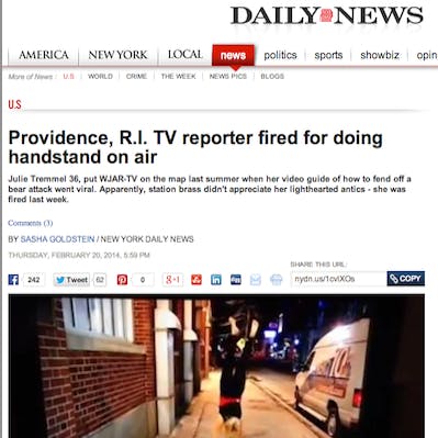 New York's Daily News is world famous for their tart headlines and coverage. They hopped on theTremmel story soon after it broke on GoLocal, knowing it was not to be missed. Their article, "Providence, R.I. TV Reporter Fired For Doing Handstand on Air," ran Thursday, replete with pictures and GIFs of Tremmel and her bear safety video.