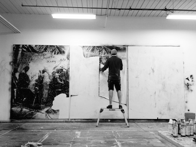 When I graduated I spent half a year fully testing the limits of each process that I had been working with while at RISD. I did this in order to eliminate certain techniques from my practice that I felt I had exhausted. When I started the Crossing the Line series, I began working only with acrylic, airbrush and toner on canvas.