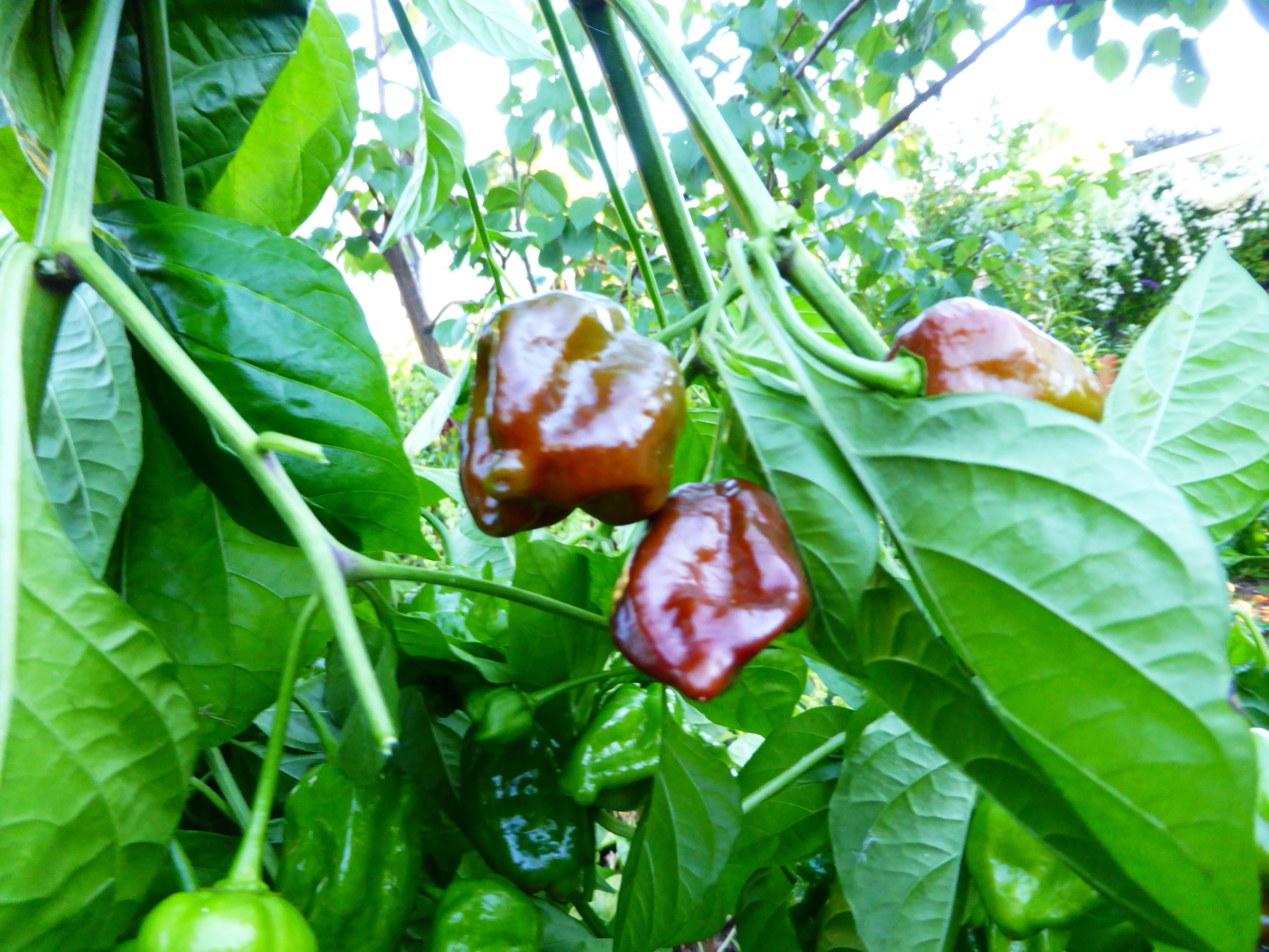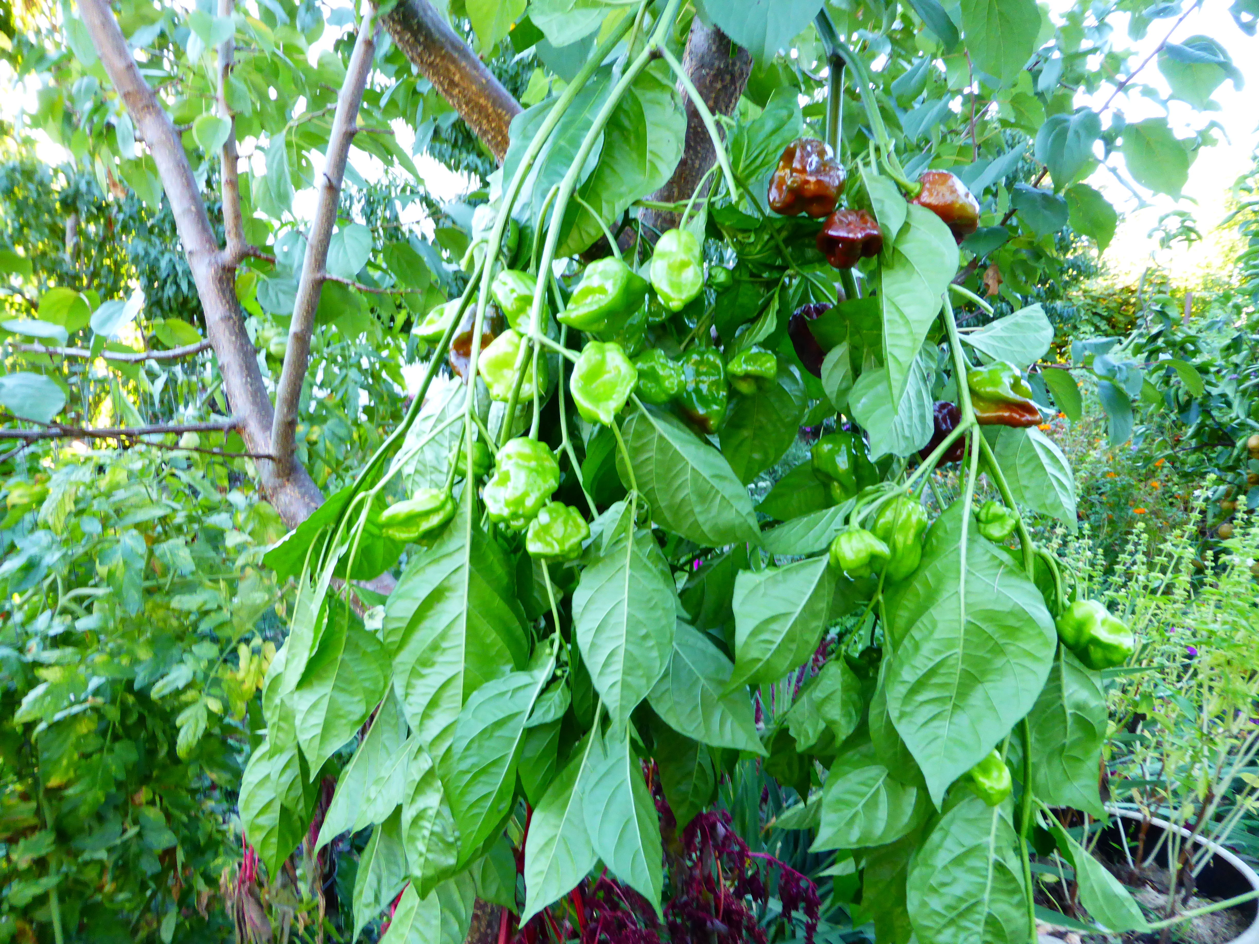 I pull up the entire plant to harvest. The peppers are beautiful to behold. Edible from shortly after the small white flowers are pollinated, it’s possible to snip off junior peppers from mid- summer forward. The largest dividends are given now when the plant is pulled up from soil, roots broken off, and stripped of fruit. Handle with care or gloves, capisum is potent and irritates the skin, lips and eyes of the unwary. Warn youngsters but never teach inspire fear.