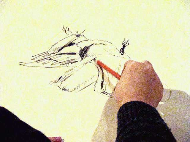 When I enter the Hi-Hat nightclub to attend Dr. Sketchy’s cabaret and life-drawing event, the model is ten seconds into a five-minute pose. Under the soft flesh typical of belly dancers, Jamie Lee Fury’s unseen muscles tense, her left arm above her tilted head, her calves and fingers flexed. Her legs and mouth shake slightly from the intense athleticism of holding absolutely still. Around her, equally intent, several dozen artists bend their heads over their sketch-pads and charcoal.
