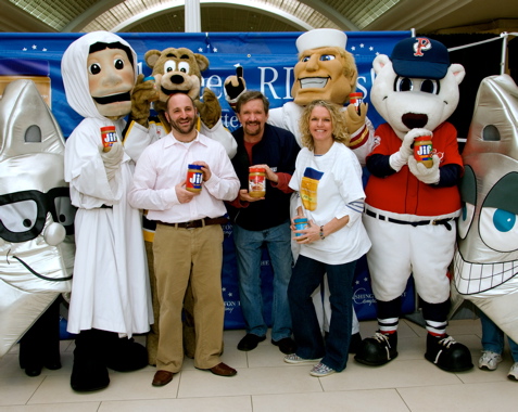 At PB Xpress's “Sports Fun Day" at the Warwick Mall, peanut-butter-donating sports fans enjoyed photos with favorite mascots from the PawSox as well as Samboni, the Providence Bruins mascot, Anchorman, the mascot of RI College, and a pair of Washington Trust Star mascots.