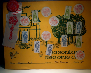 I would earn a sticker or a stamp to place on the chart for each book discussed (that's one of mine, below!). At the end of summer there would be a performance to attend if the reading goals were met. It was a show put on by a local theater group at the local high school, but to me it was like a Broadway production! As the evening concluded you would be presented with your chart, a reading club button and a ribbon to mark the completion of your summer reading commitment.