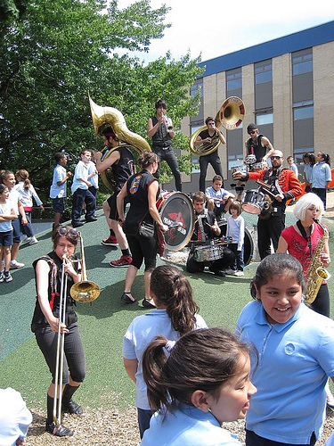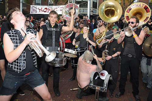 In a city enlivened by art compounds, electro-dance parties, and noisy grunge kids, the What Cheer? Brigade fits into Providence as nicely as a hipster in a vintage plaid shirt. Providence’s 18-piece brass street band has come to symbolize the brazenly independent spirit of the local arts scene. The marching band plays an eclectic mix of Bollywood, Balkans, New Orleans, Samba, and Hip Hop—all with the growling intensity of punk rock. Founded in 2005, What Cheer? is celebrating its fifth birthday this month.