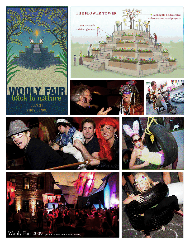 This year’s Fair features a host of exciting performers and interactive installations with a Back to Nature theme and the centerpiece of the Fair will be The Flower Tower, a 24’x24’ tiered pyramid that will be staged at The Steel Yard and will host over a hundred container gardens. During the day, each attendee will be invited to plant the Flower Tower with a plant of their choice. Following Wooly Fair, the container gardens will be distributed throughout Rhode Island.