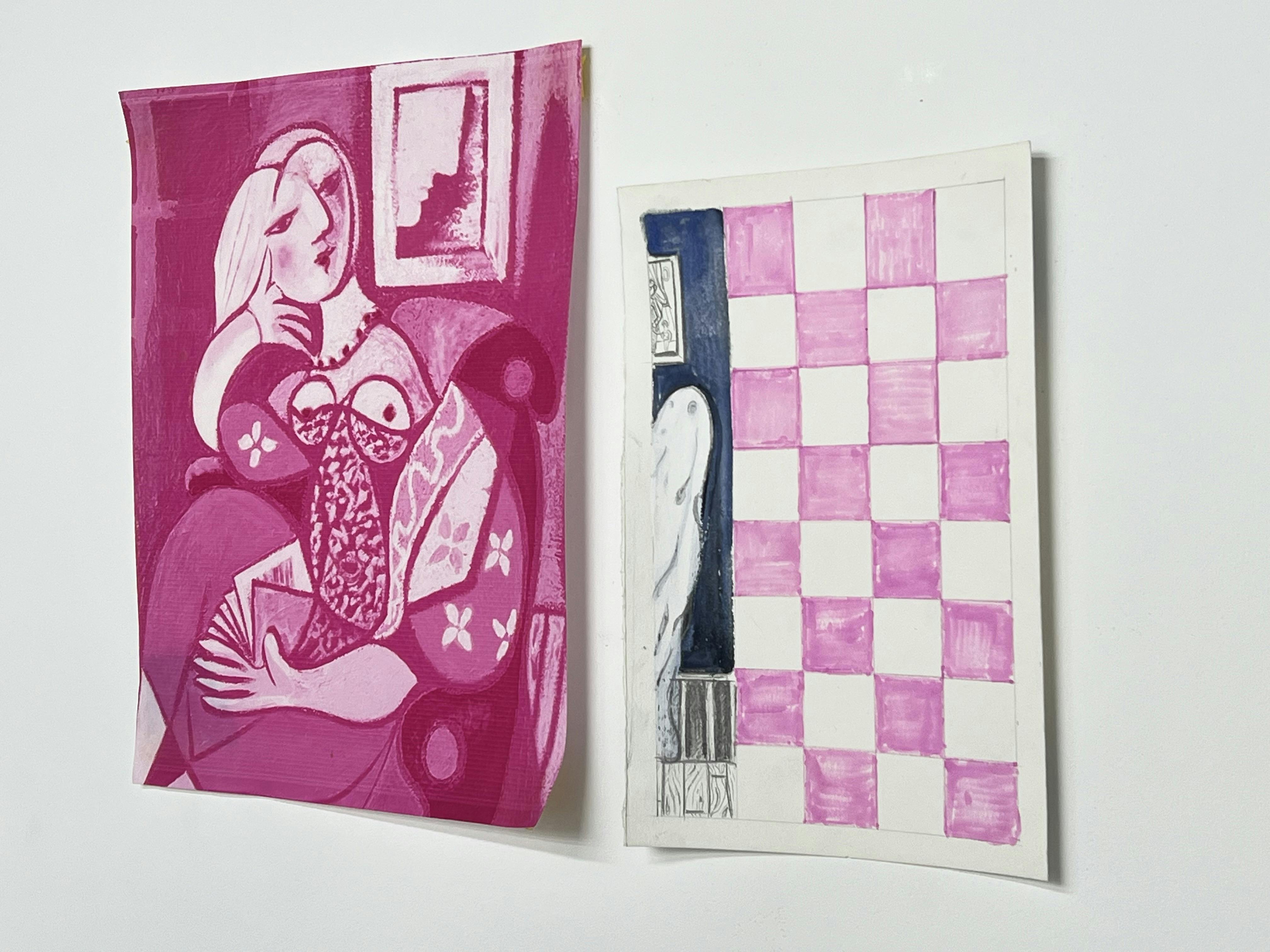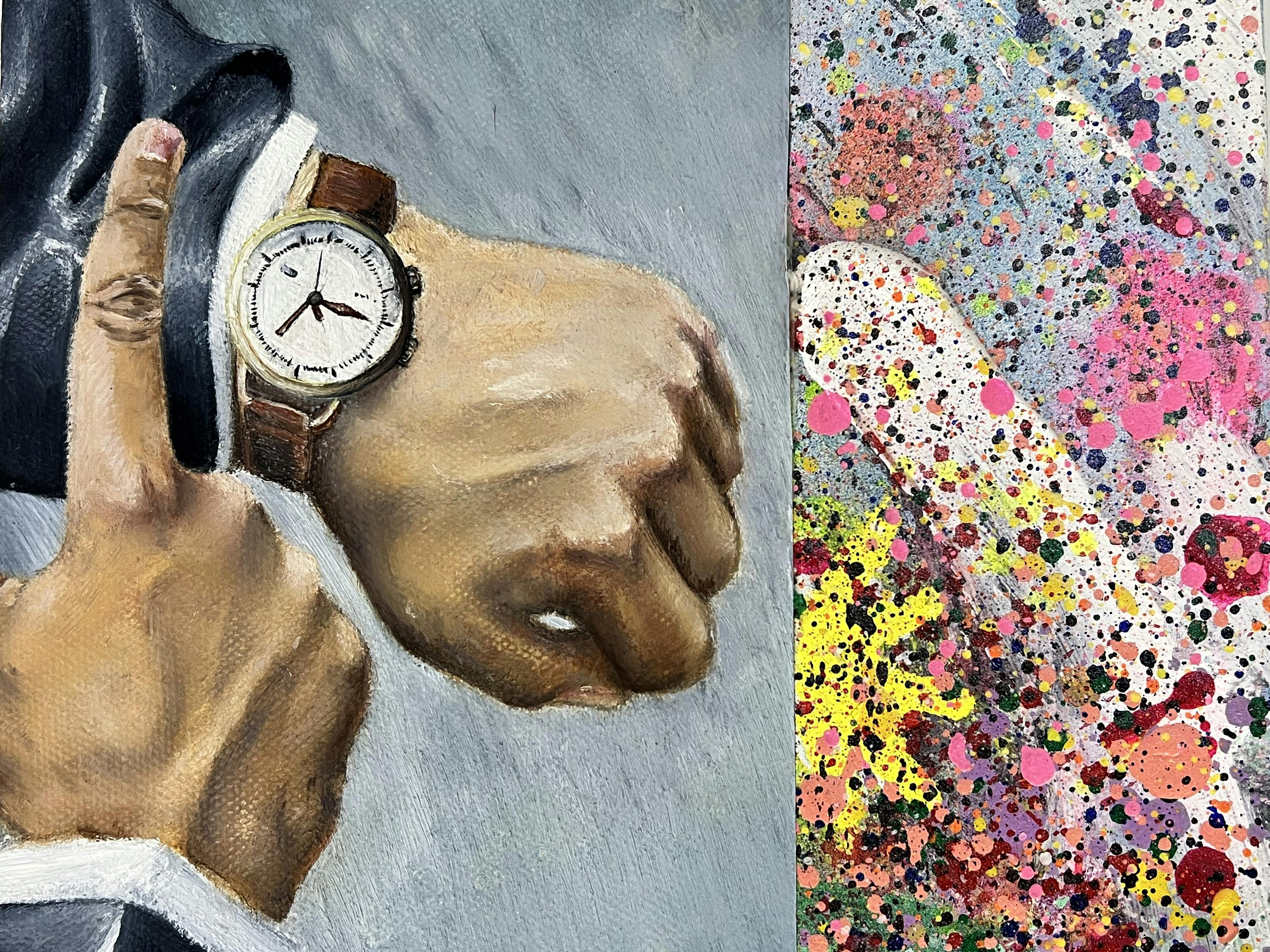 Artists are always creating new pieces and Providence painter Brandon Aguiar is currently in the process of creating a fresh body of work. From his productive studio space, he is making artworks that explore art history and pop culture with a sense of humor and creativity. One of a younger generation of painters with a passion for novel forms of representation, Aguiar also experiments with abstraction and split picture planes. To make his work, he uses methods from traditional applications of acrylics and oils, to other techniques like masking and airbrushing.