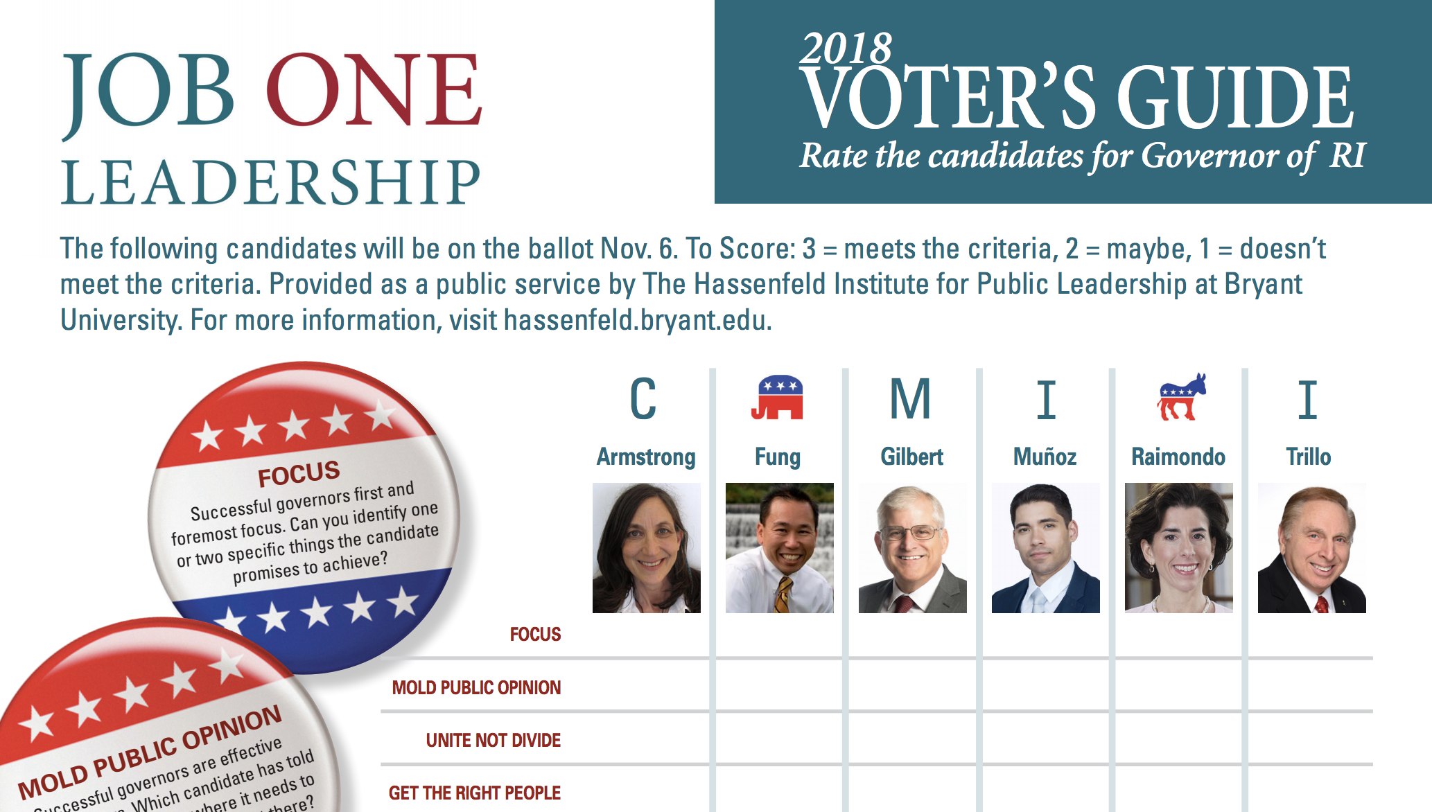 The guide does not evaluate the candidates. It provides a framework for voters to assess the capabilities of the gubernatorial candidates so they can cast an informed vote on November 6.