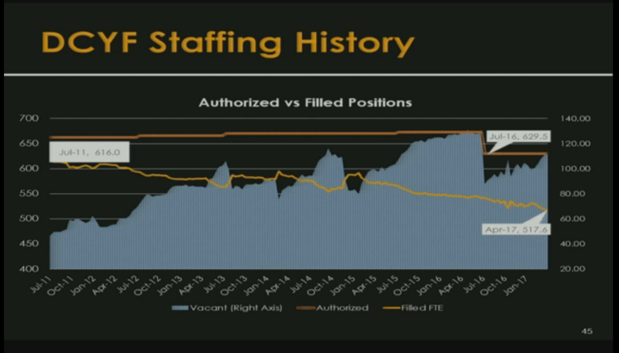 The department’s funding has been consistent over the past five years, but the Raimondo administration has failed to fill key staff positions. DCYF was funded in this year’s budget at 629 positions, but the Raimondo administration thru April 1 has staffed the agency at 517 positions — 112 positions vacant.