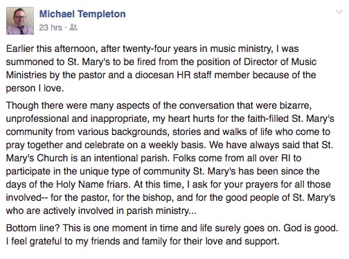 In a statement posted to Facebook on Tuesday, Michael Templeton, who resides in Warren, spoke to a conversation with church clergy that he said was "bizarre, unprofessional, and inappropriate," which led to his firing as Music Director at the Catholic church, where he served for more than five years.