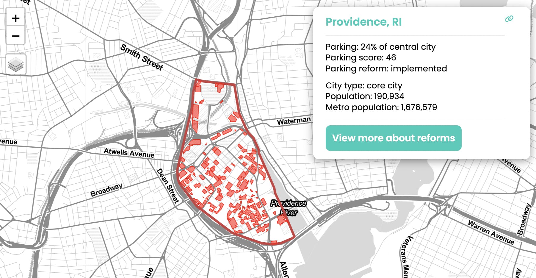 Providence scored a 50 — slightly better than average. It is "better" than a peer-sized city like Worcester which scored a 78 and has 35% of downtown used for parking.