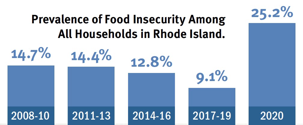 “The pandemic recession left an unprecedented number of Rhode Islanders without the means to feed their families. During July and August 2020, a random sample of 2,100 households were surveyed as part of the RI Life Index, an initiative,” according to the report. “Researchers found that 25 percent of households were worried about having adequate food.This is the highest level of food insecurity recorded in Rhode Island in twenty years.”