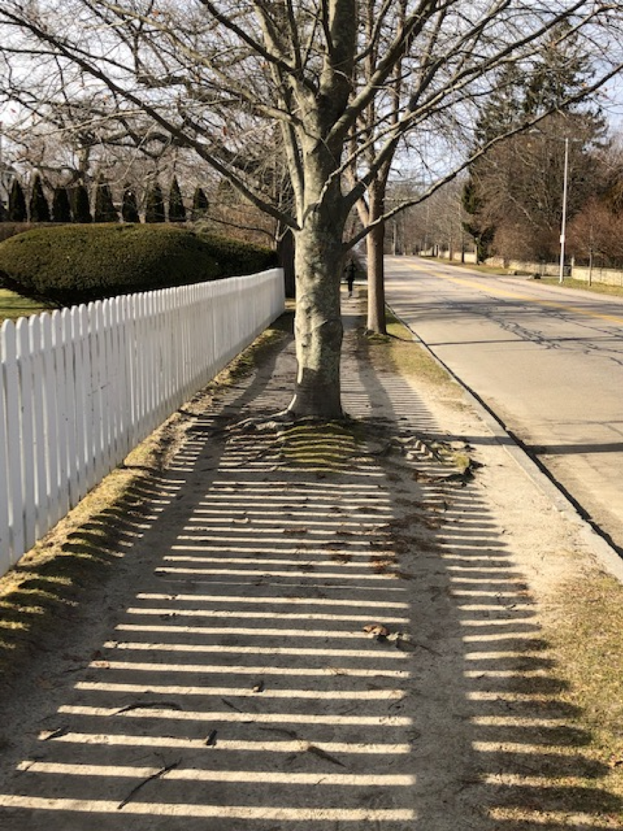The intersection of Bellevue and Narragansett Avenues is a Major intersection in the heart of Newport’s mansion / Cliff Walk tourist area, but oddly Narragansett Avenue has no sidewalks on either side of the street, leading east to the Cliff Walk where upwards of 750,000 people visit per year on foot and wheelchair OR West to Thames and Spring Streets which is the historic shopping and dining district. Above is a photo of a 60-year-old tree growing up where a sidewalk would be in a normal city. This sadly is the “main drag” to the Cliff Walk from the famed Bellevue Avenue. Good luck with your wheelchair! Mind the cars while you’re jogging in the street.