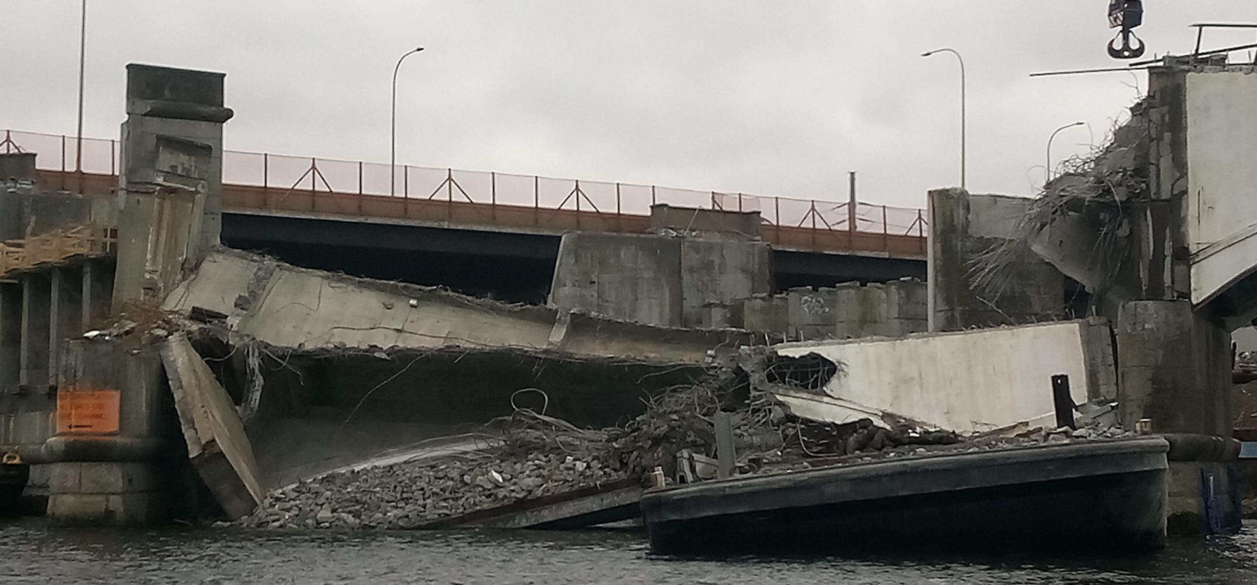 GET THE LATEST BREAKING NEWS HERE -- SIGN UP FOR GOLOCAL FREE DAILY EBLASTOn Saturday, GoLocal published photos and a video of the Washington Bridge demolition showing that demo material dumped on two barges and caused one of the barges to be submerged and another barge to be listing in the Seekonk River.