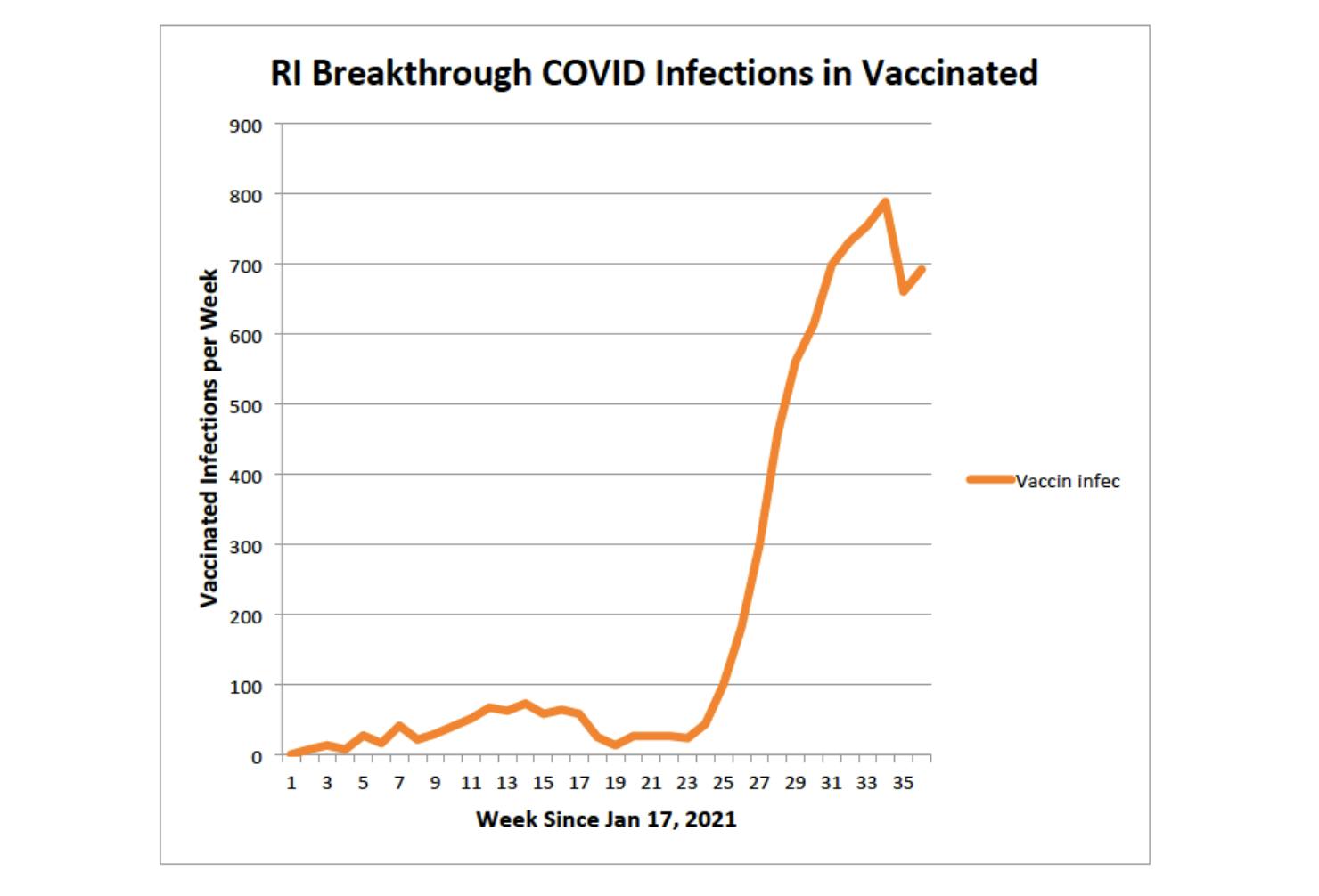 The graph below plots weekly COVID breakthrough cases in vaccinated individuals since January 17, 2021. Post-vaccination cases stayed under 100 per week until mid-July, and then increased dramatically to around 700 per week in recent weeks: