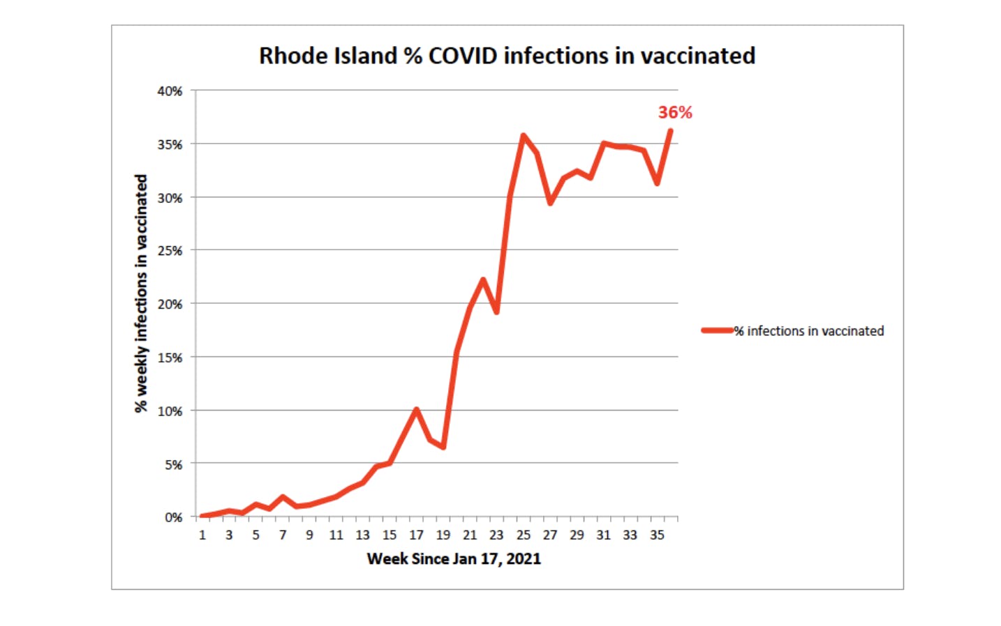 A striking figure is the proportion of COVID infections in vaccinated individuals. Last week in Rhode Island 36% of all COVID infections were in vaccinated individuals. The proportion of breakthrough infections generally stayed low, a single-digit percentage until around mid-June, and has been rapidly and significantly increasing since then.