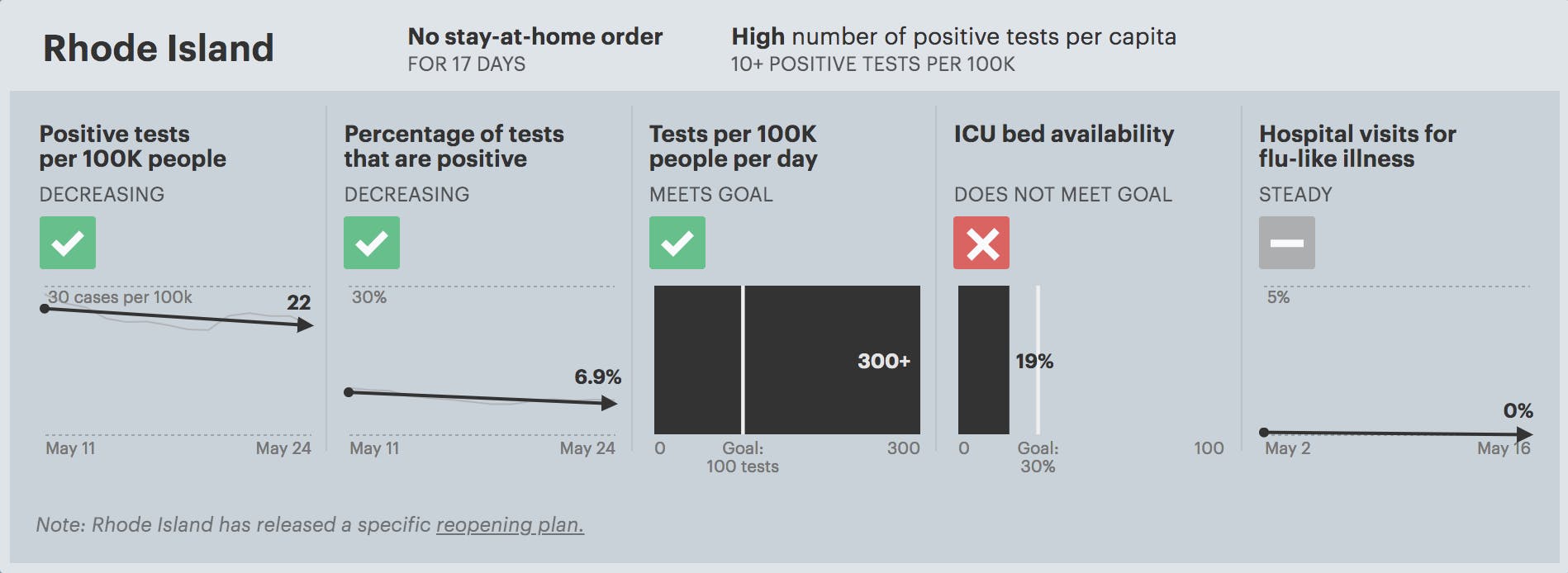 GET THE LATEST BREAKING NEWS HERE -- SIGN UP FOR GOLOCAL FREE DAILY EBLAST"To give people context on state reopenings, and what happens afterward, we are tracking metrics derived from a set of guidelines published by the White House for states to achieve before loosening restrictions. Even if these criteria are met, without a vaccine, reopening may cause an increase in cases. What’s more, some states may meet all of the criteria and still have a high infection rate," said the news research organization.