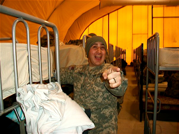 This is my friend Lopez. This was taken at Manas Air Base in Kyrgyzstan; we were on our way into Aghanistan for the first time. Lopez was in the firefight that ended my other friend's life; he was shot in the leg about two minutes before my friend Brown was killed. Lopez is at Walter Reed Military Hospital now.
