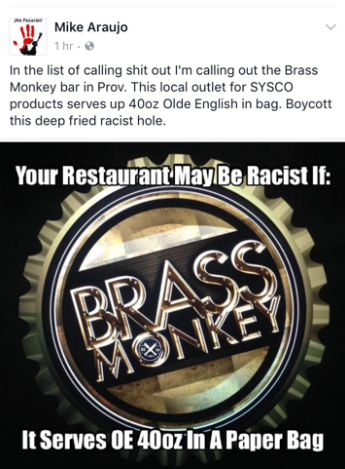 "In the list of calling s--t out I'm calling out the Brass Monkey bar in Prov. This local outlet for US Food, and Sid Wainer products serves up 40oz Olde English in bag. Boycott this deep fried racist hole," wrote Araujo.