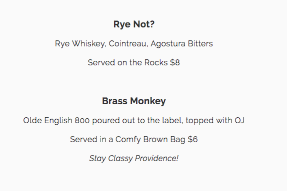 "Olde English 800 poured out to the label, topped with OJ. Served in a Comfy Brown Bag. $6. Stay classy Providence!"