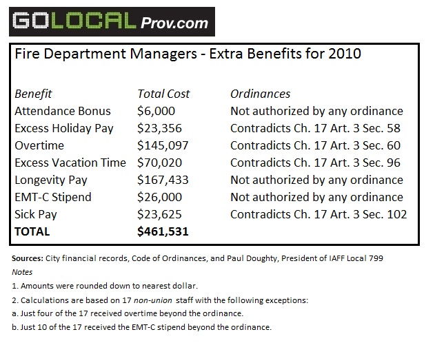When GoLocalProv contacted the Mayor David Cicilline's office for comment, spokeswoman Karen Watts said providing such benefits is established city policy. “The City providing non-union Fire Department management the same benefits as union personnel is a longstanding policy, long predating the current mayor,” Watts told GoLocalProv. “It’s important to continue to provide these benefits so that the City can attract and retain a top command staff.”