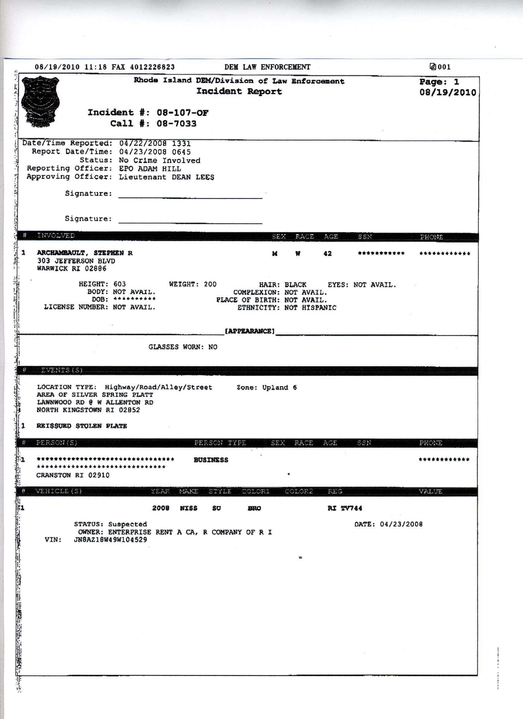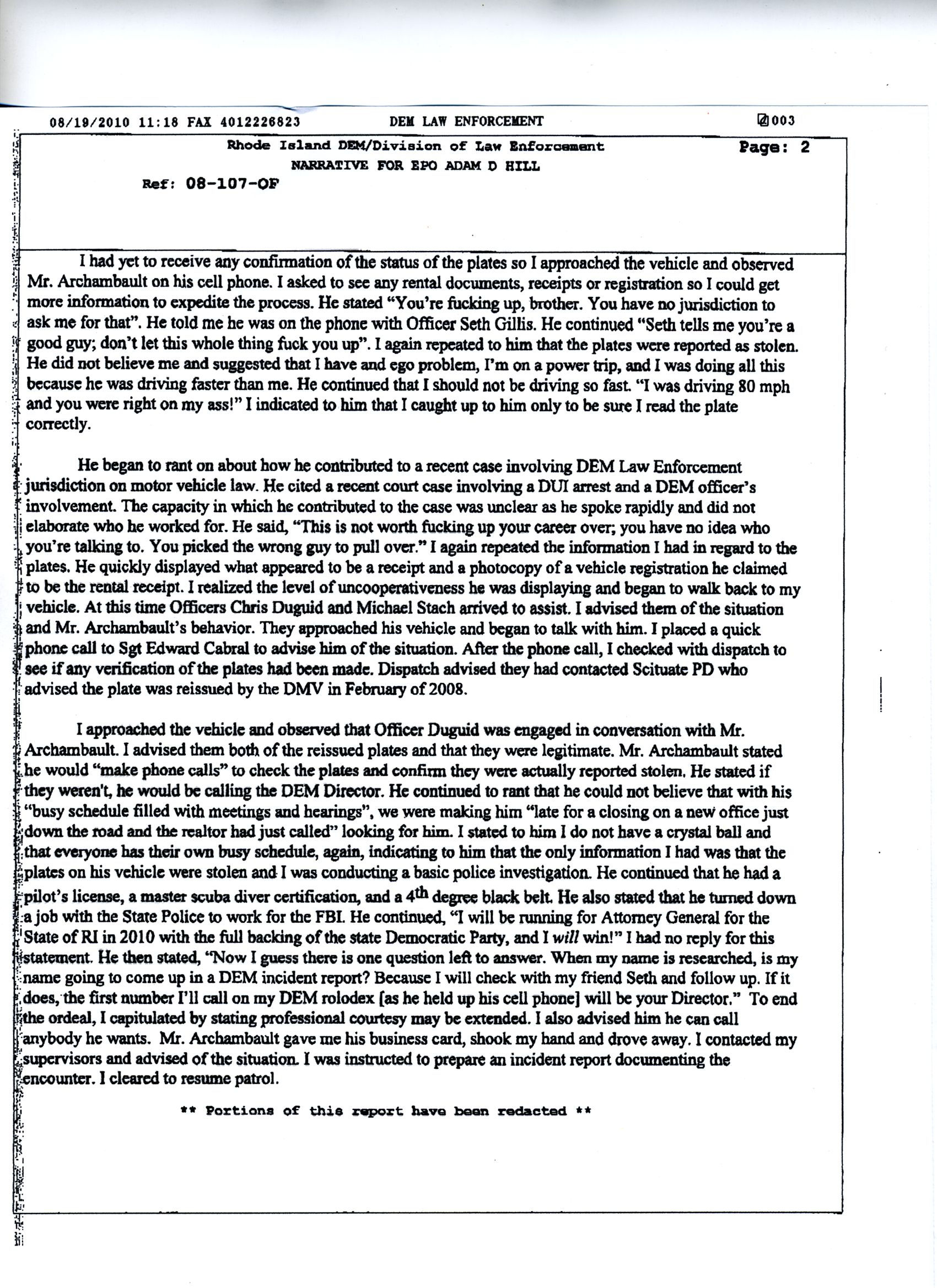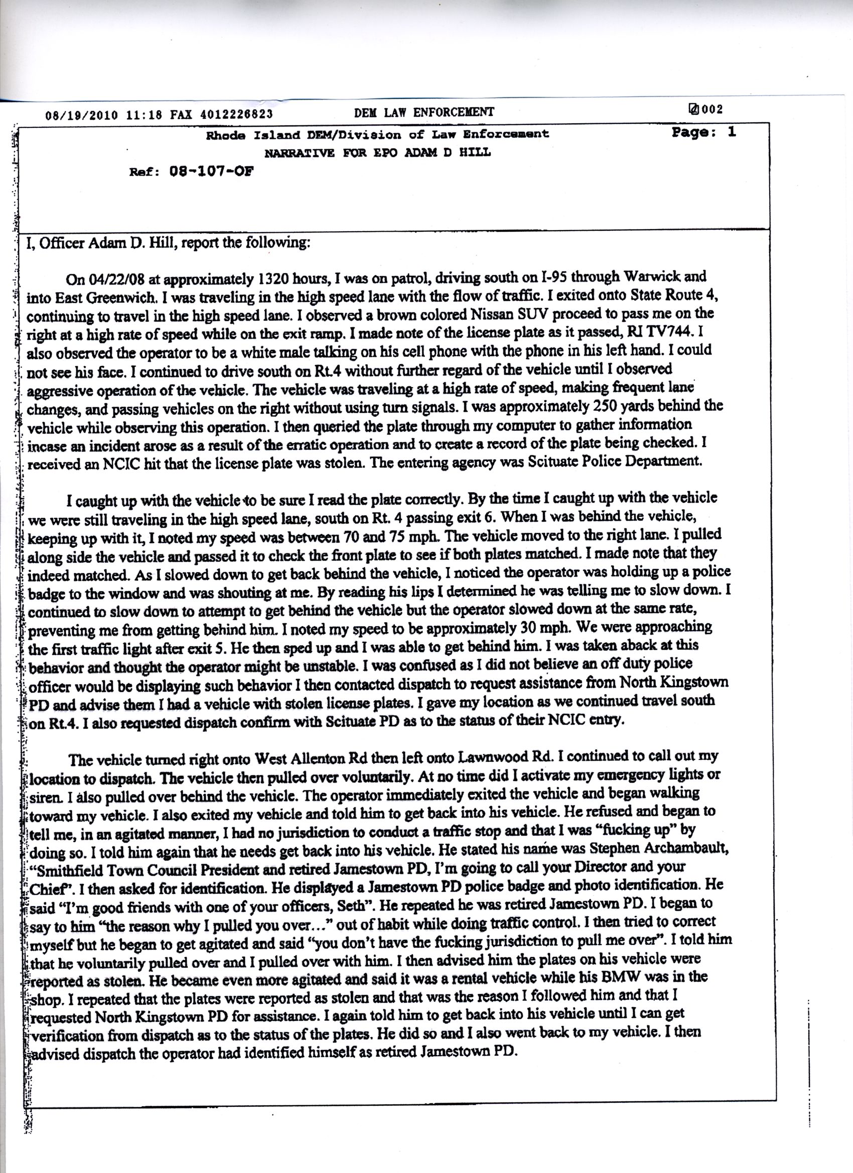 Read the police report on a confrontation between Attorney General candidate Stephen Archambault and a DEM law enforcement officer during a traffic stop.