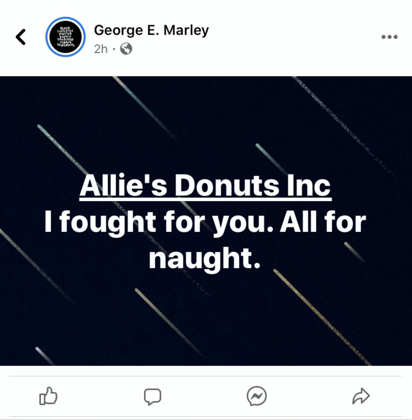 George Marley, one of the hundreds who had originally supported Allie's decision to rescind the policy discount took to Facebook and wrote, "Allie's Donuts, Inc. I fought for you. All for naught."