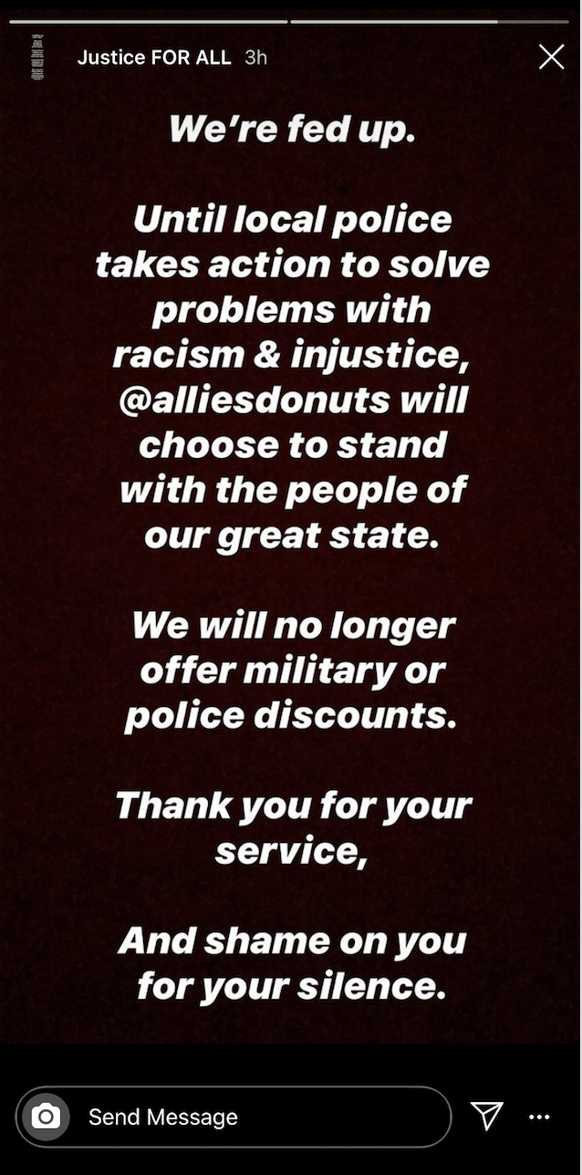 “Until local police take action to solve problems with racism and injustice, @alliesdonuts will choose with the people of our great state,” wrote Allie’s in their initial statement. “We will no longer offer military or police discounts.”