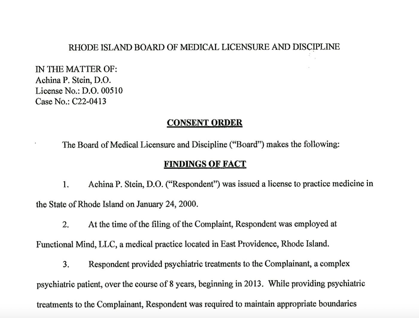 GET THE LATEST BREAKING NEWS HERE -- SIGN UP FOR GOLOCAL FREE DAILY EBLASTOn Wednesday, the Medical Licensure and Discipline Board signed a consent order reprimanding Stein, who, at the time of the complaint filing, was employed at Functional Mind, LLC, in East Providence, which is now located on Wickenden Street in Providence.