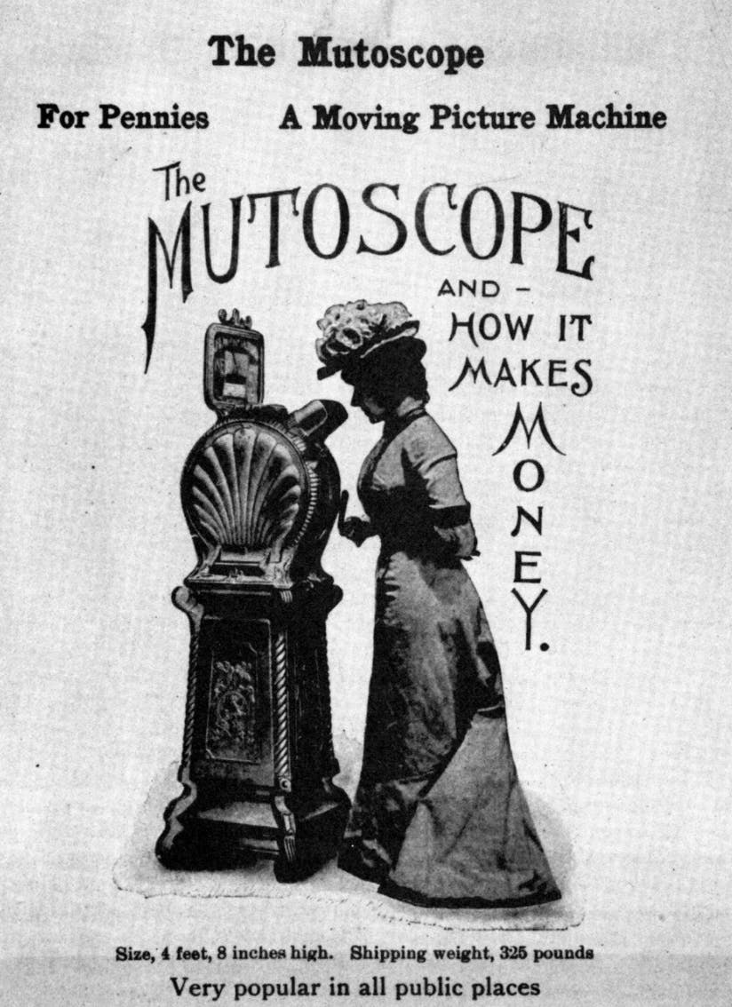 The mutoscope was not really a machine but rather a coin-operated (a penny), hand-turned movie viewer. Much like today’s Rolodex, it was a flipbook in black and white. The individual image frames were photographic prints on flexible cards attached to a circular core. We viewed the electrically lit cards through a single lens enclosed by a hood. The reel was driven by a hand crank.