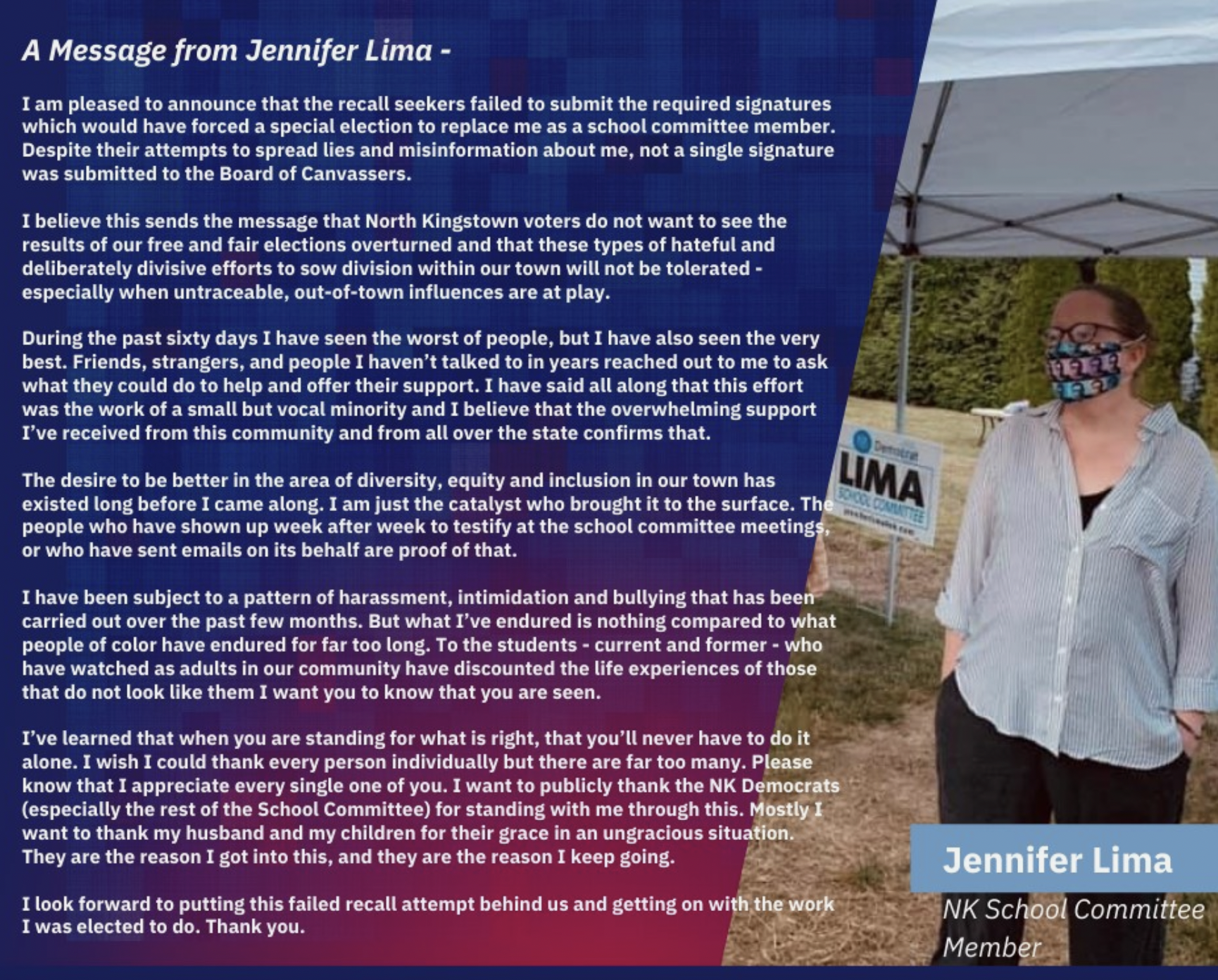 “Jennifer Lima was elected last fall with more votes than any other municipal candidate. She ran on a campaign to improve outcomes for all students and has done nothing but work to fulfill her campaign promises ever since. This recall petition was just a waste of time and money and is only meant to intimidate town officials into staying quiet,” said North Kingstown Democratic party chair Anne Geertman.