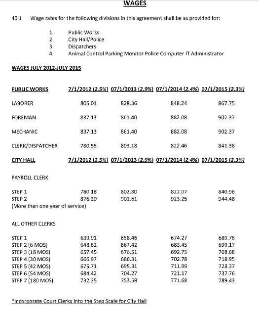 A review of the contracts negotiated while Central Falls was very much in the throes of the bankruptcy process reveals that the three major unions—firefighters, police, and other city workers affiliated with AFSCME Council 94—are set to receive on average 2.5 percent annual raises until 2016, when the contracts expire. The first round of raises took effect in July 2012. (See below tables for examples.)