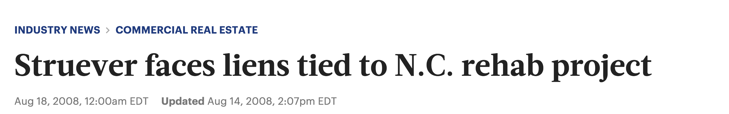 "Baltimore's Struever Bros. Eccles & Rouse is under fire from contractors who have filed claims exceeding $1.2 million for unpaid work at a redevelopment project in North Carolina," wrote the Baltimore Business Journal.