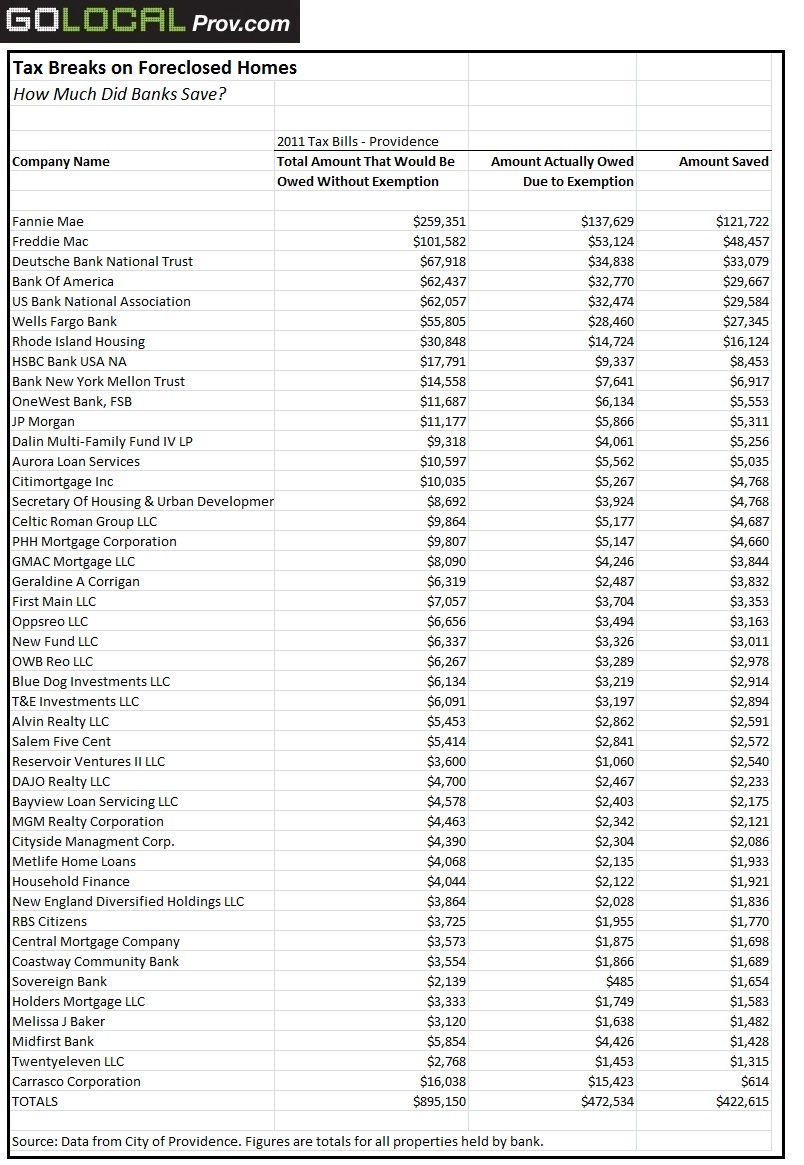 This year, 44 banks and other companies have foreclosed on just over 341 properties in Providence, as of September. But those banks retained owner-occupied homestead exemptions on about 200 of those properties. In all, the exemptions—some as high as 50 percent—saved those banks about $422,615 on their 2011 tax bills, a GoLocalProv review of city data found. (See below chart for the complete breakdown.)